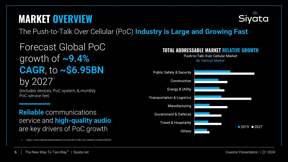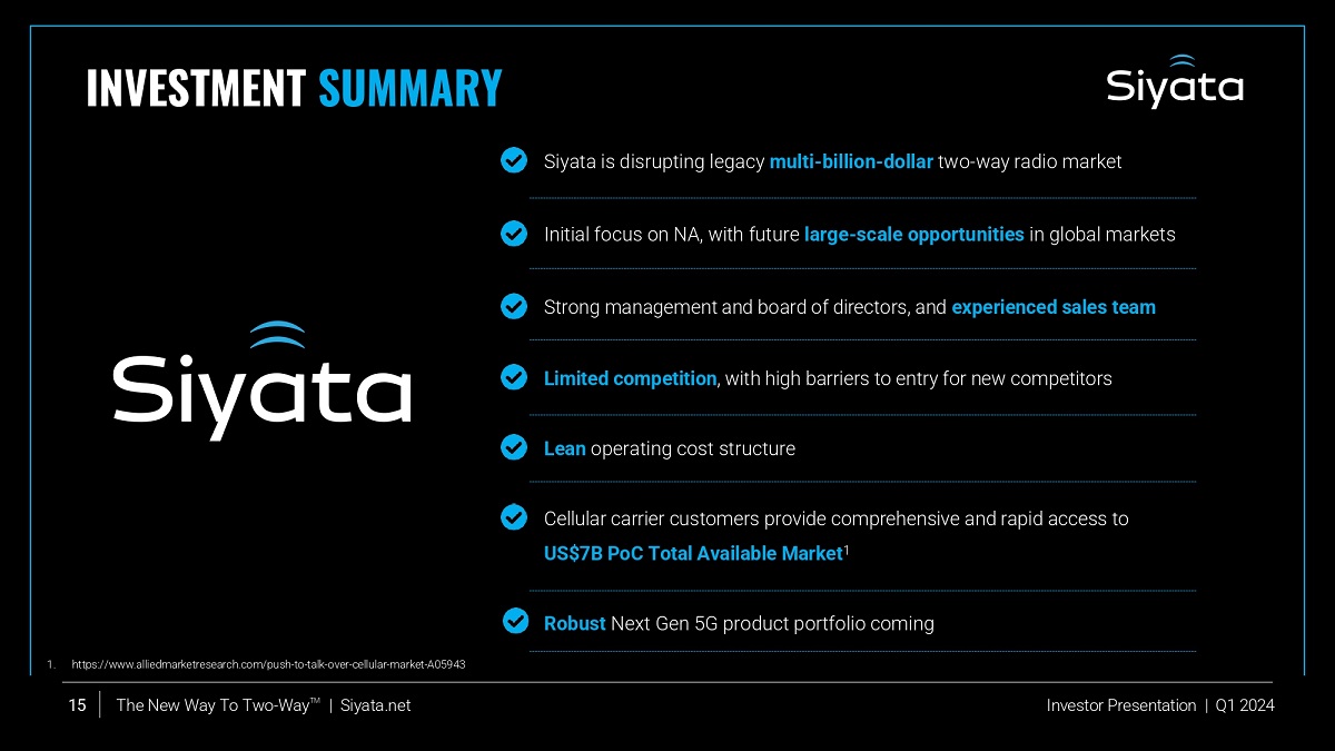 Siyata正在颠覆传统的数十亿美元双向无线电市场最初专注于NA,未来在全球市场的大规模机会强大的管理层和董事会,经验丰富的销售团队有限的竞争,新竞争对手进入壁垒高精益运营成本结构蜂窝运营商客户提供全面、快速的7B美元POC总可用市场1稳健的下一代5G产品组合即将到来15投资摘要新的双向方式TM | Siyata.net投资者介绍| 2024年第一季度1. https://www.alliedmarketresearch.com/push-to-talk-over-cellul-market-A05943
