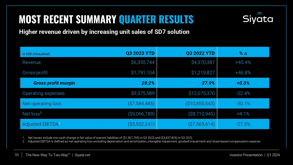 11最近一个季度的摘要导致SD7解决方案单位销量增加推动的收入增加% vv Q3 2022 YTD Q3 2023 YTD美元计(未经审计)+ 45.4% $ 4,370,387 $ 6,355,744收入+ 46.8% $ 1,219,827 $ 1,791,104毛利润+ 0.3% 27.9% 28.2%毛利率-22.4% $ 12,075,370 $ 9,375,589营业费用-30.1%(10,855,543美元)(7,584,485美元)净营业亏损+ 4.1%(8,710,945美元)(9,066,789美元)净亏损1-27.3%(7,565,614美元)(5,502,241美元)调整后EBITDA 21。净亏损包括2023年第三季度(1,561,765美元)和2022年第三季度(3,437,826美元)认股权证负债公允价值的非现金变动。2.调整后EBITDA定义为不包括折旧和摊销、无形减值、商誉减值和基于股份的补偿费用的净经营亏损投资者介绍| 2024年第一季度双向TM的新方式| Siyata.net