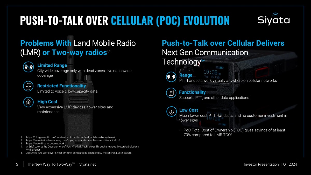 Siyata的目标是通过下一代通信技术颠覆传统的Land Mobile Radio(LMR)行业,成为快速增长的Push to Talk over Cellular(POC)行业的全球领导者。3投资者宣讲会| 2024年Q1双向新方式TM |思雅达网