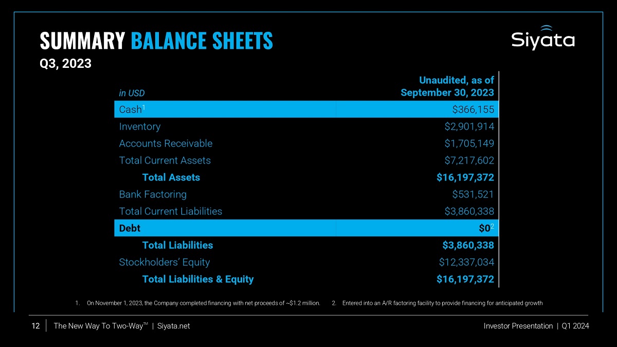 12份未经审计的汇总资产负债表,截至2023年9月30日,单位:美元366,155现金1美元2,901,914美元存货1,705,149美元应收账款7,217,602美元流动资产总额16,197,372美元总资产531,521美元银行保理业务3,860,338美元流动负债总额02美元债务3,860,338美元总负债12,337,034美元股东权益16,197,372美元总负债和权益1。2023年11月1日,公司完成融资,净收益约120万美元。2.订立A/R保理设施,为预期增长提供融资2023年Q3投资者说明会| 2024年Q1双向新方式TM |思雅达网