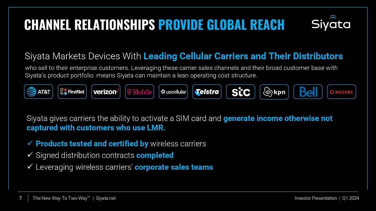 7 Channel RelationSHIPs为Global REACH Siyata Markets设备提供领先的蜂窝运营商及其分销商,这些分销商向其企业客户进行销售。凭借Siyata的产品组合利用这些运营商销售渠道及其广泛的客户群,意味着Siyata可以保持精益的运营成本结构。Siyata让运营商能够激活SIM卡并产生收入,否则这些收入不会在使用LMR的客户中获得。x无线运营商测试和认证的产品x已签署的分销合同完成x利用无线运营商的企业销售团队投资者介绍| 2024年第一季度通往双向的新方式TM | Siyata.net
