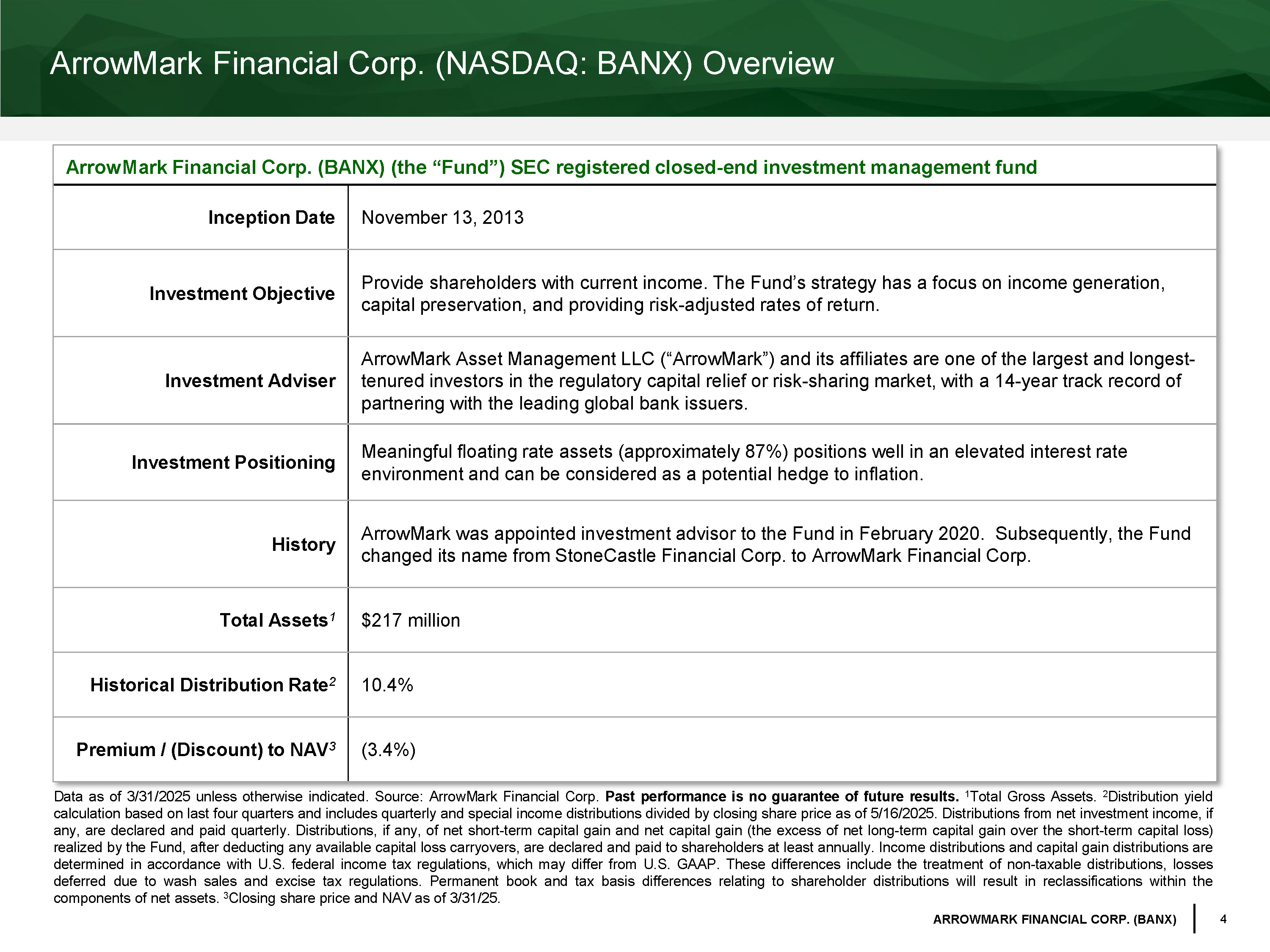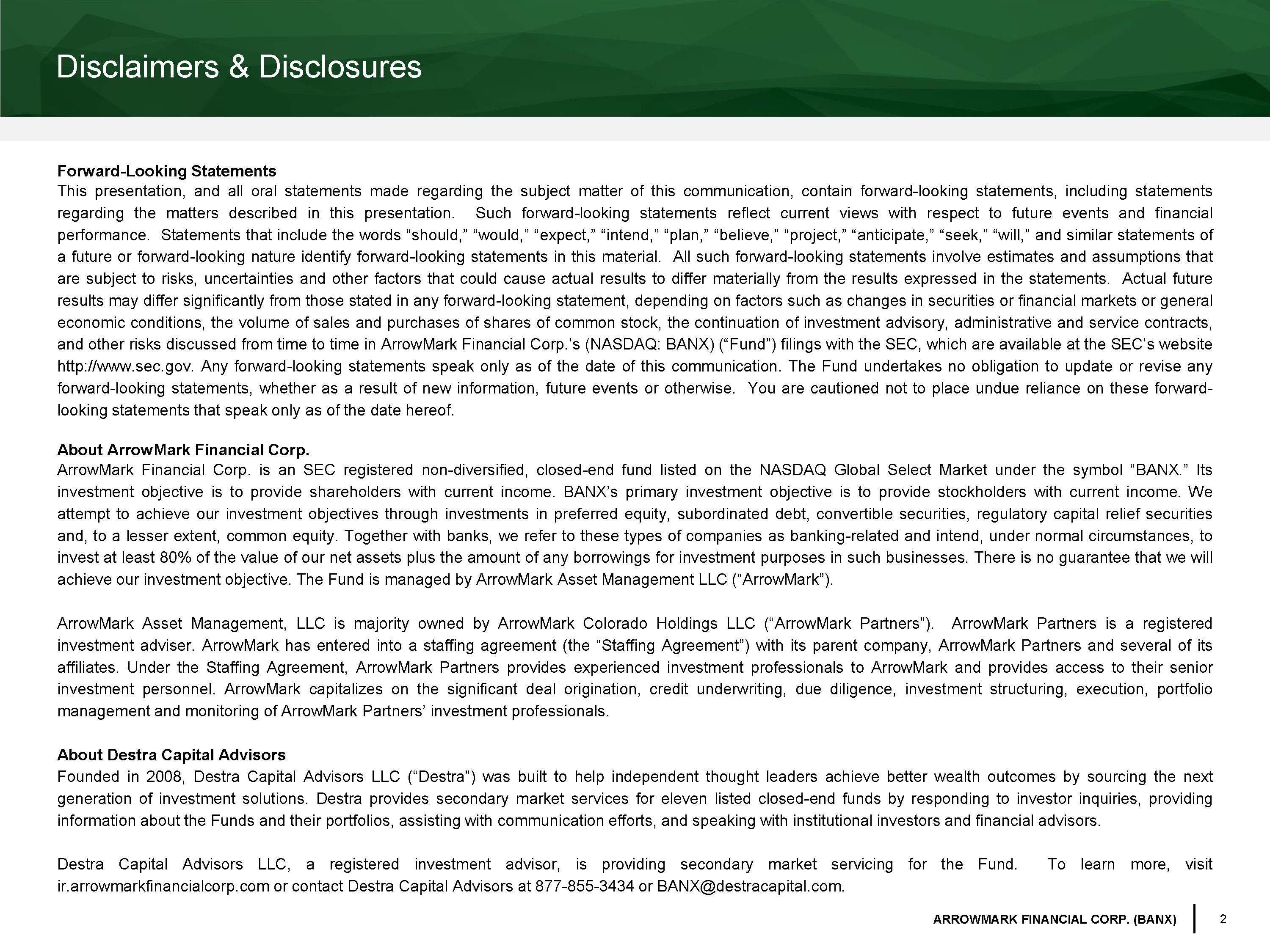2 ARROWMark Financial CORP.(BANX)免责声明&披露前瞻性陈述本演示文稿以及就本通讯主题所作的所有口头陈述均包含前瞻性陈述,包括关于本演示文稿中所述事项的陈述。此类前瞻性陈述反映了当前对未来事件和财务业绩的看法。包括“应该”、“将”、“期望”、“打算”、“计划”、“相信”、“项目”、“预期”、“寻求”、“将”等词语的陈述,以及未来或前瞻性的类似陈述natureidentifyforward-lookingstatementsinthismaterial。所有这些前瞻性陈述涉及作为主体风险、不确定性和其他因素的估计和假设,这些因素可能导致实际结果与在陈述中表达的结果存在重大差异。未来的实际结果可能与任何前瞻性陈述中的陈述有显着差异,这取决于以下因素:不安全或金融市场或一般经济条件、销售和普通股股票购买的演变、投资咨询的延续、行政和服务合同以及从时间时间点讨论的其他风险;ArrowMarkFinancialCorp.(纳斯达克股票代码:BANX)(“基金”)向美国证券交易委员会提交的文件,可在美国证券交易委员会网站http://www.sec.gov.Anyforward-lookingstatementsspeakonlyasofthedateofthiscommunication.theFundundaundertakesnoobligationtoupdateorreviseany formetoTimeinArrowMarkFinancialCorp.(NASDAQ:TERM0)(“基金”)向SEC提交的文件Youarecautionednottoplaceunduerelianceontheseforward-lookingstatementsthatspeakonlyasofthedatehereof。关于ArrowMarkFinancialCorp。ArrowMark金融 Corp.是一只在SEC注册的非多元化封闭式基金,在纳斯达克全球精选市场上市,代码为“BANX”。其投资目标是为股东提供当期收益。BANX的主要投资目标是为股东提供当前的收益。我们试图通过投资sinpreferredequity、次级债、可转换证券、监管资本减免证券,以及完全范围内的共同股权来实现我们的投资目标。与银行一起,是指那些与银行相关的公司的类型,并且在不正常的情况下,打算投资至少80%的valueofournetassetsplustheamountofanyborrowingsforinvestmentpurposesinsuchbusinesses。ThereisnoGuaranteethatwewill achieveourinvestmentobjective.theFundismanagedbyArrowMarkAssetManagementLLC(“ArrowMark”)。ArrowMark Asset Management,LLC由ArrowMark Colorado Holdings LLC(“ArrowMark Partners”)持有多数股权。ArrowMark Partners是一家注册投资顾问。ArrowMarkhasenteredintoastaffingAgreement(“StaffingAgreement”)与sparentcompany、ArrowMarkPartnersand several of its affiliates。根据StaffingAgreement,ArrowMark Partners向ArrowMark提供经验丰富的投资专业人士,并提供与他们的高级投资人员的接触。ArrowMark充分利用了ArrowMarkPartners投资专业人士的重大交易发起、信贷承销、尽职调查、投资结构、执行、投资组合管理和监控。关于DestraCapitalAdvisors,Destra Capital Advisors LLC(“Destra”)成立于2008年,旨在通过寻找下一代投资解决方案,帮助独立思想领袖实现更好的财富成果。Destraprovidessecondarymarketservicesforelevenlistedclosed-end fundsbyrespondingtoinvestorinquiries,提供有关基金及其投资组合的信息,协助沟通努力,并与机构投资者和财务顾问交谈。注册投资顾问Destra Capital Advisors LLC正在为该基金提供二级市场服务。要了解更多信息,请访问ir.arrowmarkfinancialcorp.com或contactdestraCapitalAdvisorsat877-855-3434orBANX@destracapital.com。