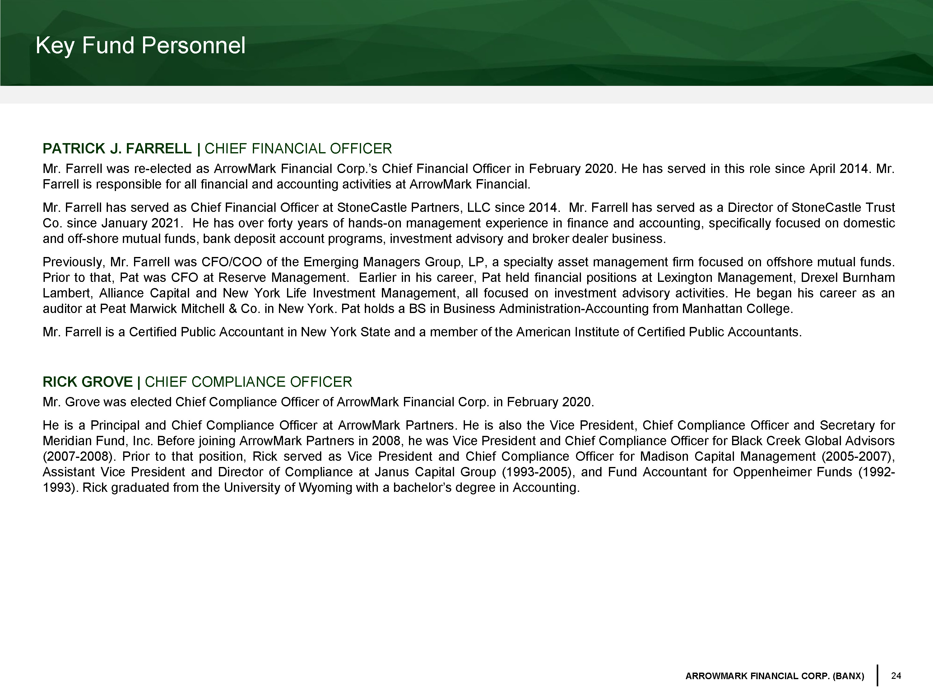 24 Arrowmark Financial CORP.(BANX)关键基金人士Patrick J.Farrell |首席财务官Farrell先生重新当选为ArrowMarkFinancialCorp.的首席财务官inFebruary2020.hehasservedinthisrolesinceApril2014.Mr。FarrellisibleForallfinancialandaccountingactivitiesatArrowMarkFinancial。FarrellhasservedasChiefFinancialOfficeratStoneCastlePartners,LLC自2014年以来。Mr.FarrellhasservedasaDirectorofStoneCastleTrust Co.sinceJanuary2021。HEhasovertyearsofhands-on managementexperience infinance and accounting,specifically focused on domestic and off-shoreMutualfunds,bankDepositaccount programs,investmentadvisory and broker-dealerbusiness。此前,Mr.FarrellwasCFO/COOoftheEmergingManagersGroup,LP,aspecialtyassetmanagementfirmfocusedonoffshoreMutualfunds。在此之前,PatwasCFOatReserveManagement。Earlierinhiscareer,PatheldfinancialpositionsatLexingtonManagement,DrexelBurnham Lambert,AllianceCapital和NewYorkLifeInvestmentManagement,allfocusedoninvestmentadvisoryactivities.hebeganhiscareerasan auditoratPeatMarwickMitchell & Co.inNewYork.patholdsaBSinBusinessAdministration-AccountingfromManhattanCollege。FarrellisaCertifiedPublicAccountantinNewYorkStateandamemberoftheAmericanInstituteofCertifiedPublicAccountants。RICKGrove |首席合规官Mr.GrovewasectedChiefComplianceOfficerofArrowMarkFinancialCorp.inFebruary2020。HeisaPrincipalandChiefComplianceOfficeratArrowMarkPartners.HeisalSotheVice President,ChiefComplianceOfficerandSecretaryfor MeridianFund,Inc.BeforeJoiningArrowMarkPartnersin2008,HewasVice President and ChiefComplianceOfficerforBlackCreekGlobalAdvisors(2007-2008)。Priortothatposition,RickservedasVice President and ChiefComplianceOfficerforMadisonCapitalManagement(2005-2007),AssistantVice President and DirectorofComplianceatJanusCapitalGroup(1993-2005),and FundAccountant