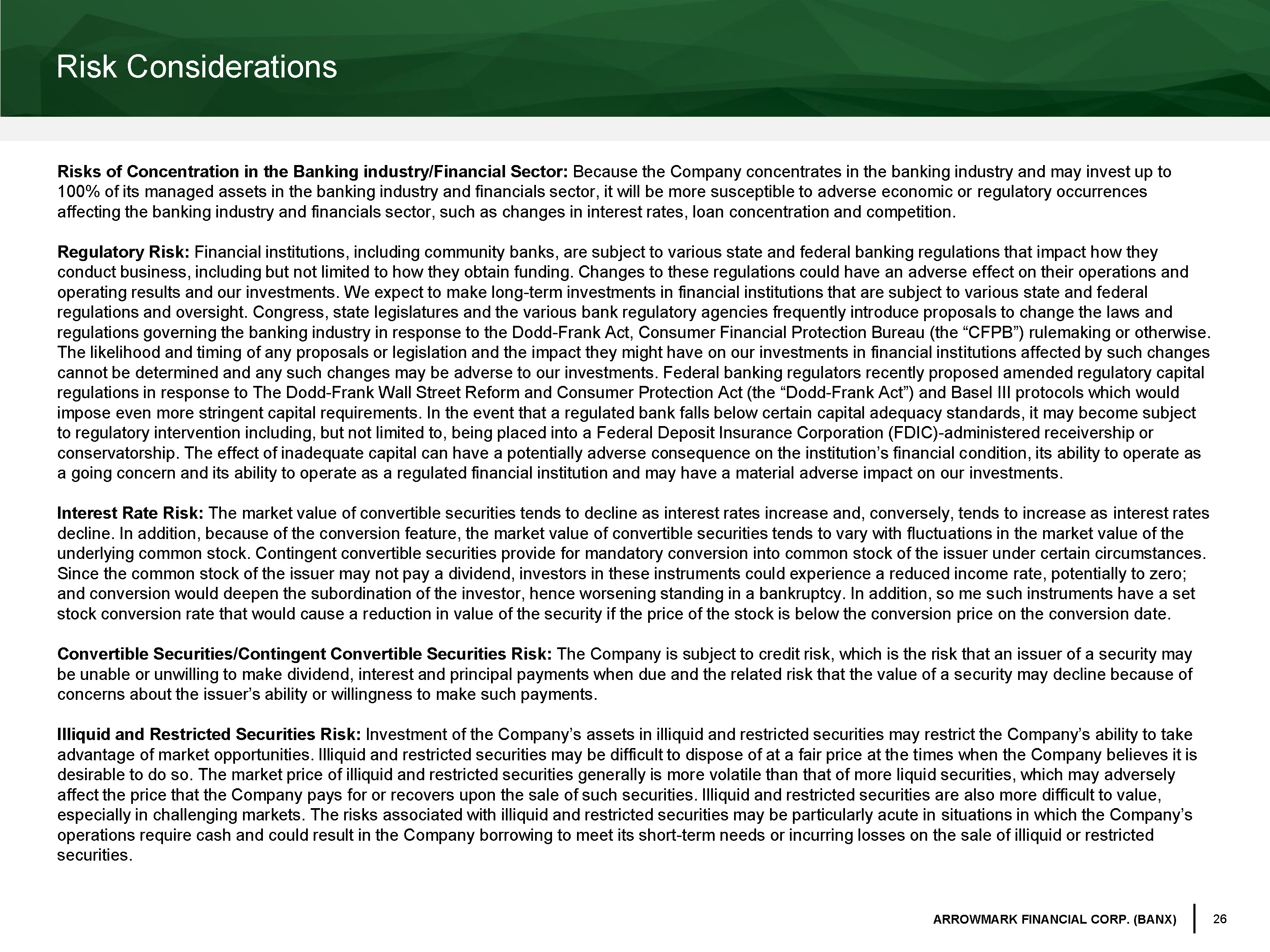 26阿罗马克金融股份有限公司(BANX)风险考虑因素银行业/金融领域集中的风险:由于公司集中于银行业,可能将其管理的资产的最高100%投资于银行业和金融领域,因此将更容易受到影响银行业和金融领域的不利经济或监管事件的影响,例如利率变化、贷款集中度和竞争等。监管风险:包括社区银行在内的金融机构受到影响其开展业务方式的各种州和联邦银行法规的约束,包括但不限于其获得资金的方式。这些法规的变更可能会对其运营和经营业绩以及我们的投资产生不利影响。我们预计将对受各种州和联邦法规和监督的金融机构进行长期投资。国会、州立法机构和各银行监管机构针对《多德-弗兰克法案》(Dodd-Frank Act)、消费者金融保护局(“CFPB”)规则制定或其他方面,频繁提出修改银行业法律法规的提案。无法确定任何提案或立法的可能性和时间以及它们可能对我们受此类变化影响的金融机构投资产生的影响,任何此类变化都可能对我们的投资不利。联邦银行监管机构最近提议修订监管资本规定,以响应《多德-弗兰克华尔街改革和消费者保护法案》(“多德-弗兰克法案”)和巴塞尔协议III,后者将施加更严格的资本要求。如果一家受监管的银行低于某些资本充足标准,它可能会受到监管干预,包括但不限于被置于联邦存款保险公司(FDIC)管理的接管或监管之下。资本不足的影响可能对该机构的财务状况、其持续经营能力以及作为受监管金融机构的运营能力产生潜在的不利影响,并可能对我们的投资产生重大不利影响。利率风险:可转换证券的市值往往会随着利率的提高而下降,反之,往往会随着利率的下降而增加。此外,由于转换特性,可转换证券的市值往往随标的普通股市值的波动而变化。或有可转换证券规定在某些情况下强制转换为发行人的普通股。由于发行人的普通股可能不会支付股息,这些工具的投资者可能会经历收入减少,可能为零;而转换将加深投资者的从属地位,从而在破产中恶化地位。此外,So me such instruments have a set stock conversion rate,which will cause a reduction of value of the securities if the price of the stock is below the conversionprice on the conversion date at the conversion date。可转换证券/或有可转换证券风险:公司面临信用风险,是指证券的发行人可能无法或不愿意在到期时支付股息、利息和本金的风险以及由于担心发行人的支付能力或意愿而导致证券价值可能下降的相关风险。非流动性和受限证券风险:将公司资产投资于非流动性和受限证券可能会限制公司利用市场机会的能力。非流动性和受限制的证券可能难以在公司认为可取的时候以合理的价格处置。非流动性和受限制证券的市场价格通常比流动性更强的证券更具波动性,这可能会对公司在出售此类证券时支付或收回的价格产生不利影响。非流动性和受限制的证券也更难估值,尤其是在充满挑战的市场中。在公司运营需要现金的情况下,与非流动性和受限证券相关的风险可能特别严重,并可能导致公司借款以满足其短期需求,或因出售非流动性或受限证券而蒙受损失。