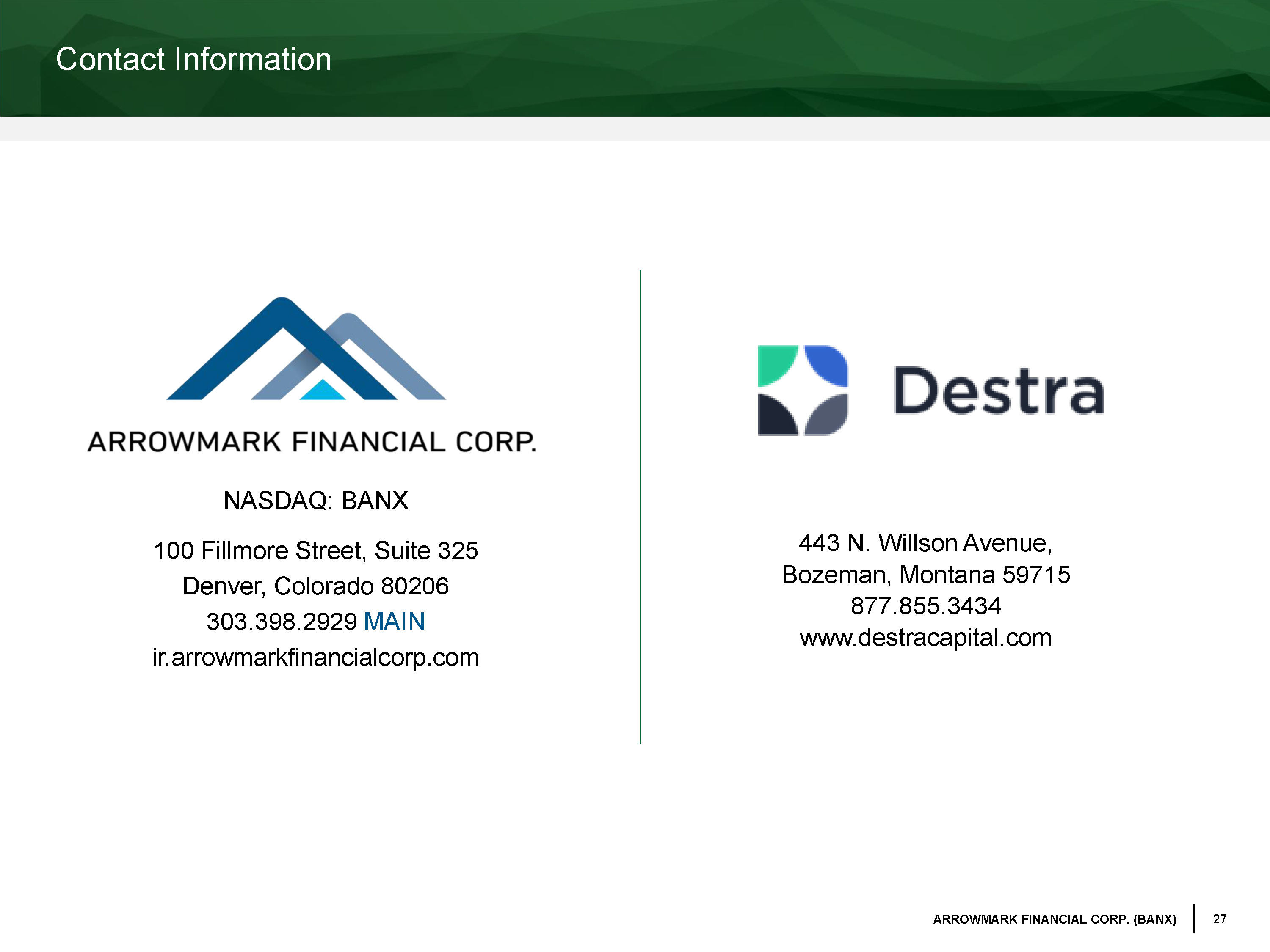 27 ARROWMark Financial CORP.(BANX)NASDAQ:BANX 100 Fillmore Street,Suite 325 Denver,Colorado 80206303.3 98.29 29 MAIN ir.arrowmarkfinancialcorp.com联系方式443 N. WillsonAvenue,Bozeman,Montana 59715877.85 5.34 34 www.destracapital.com