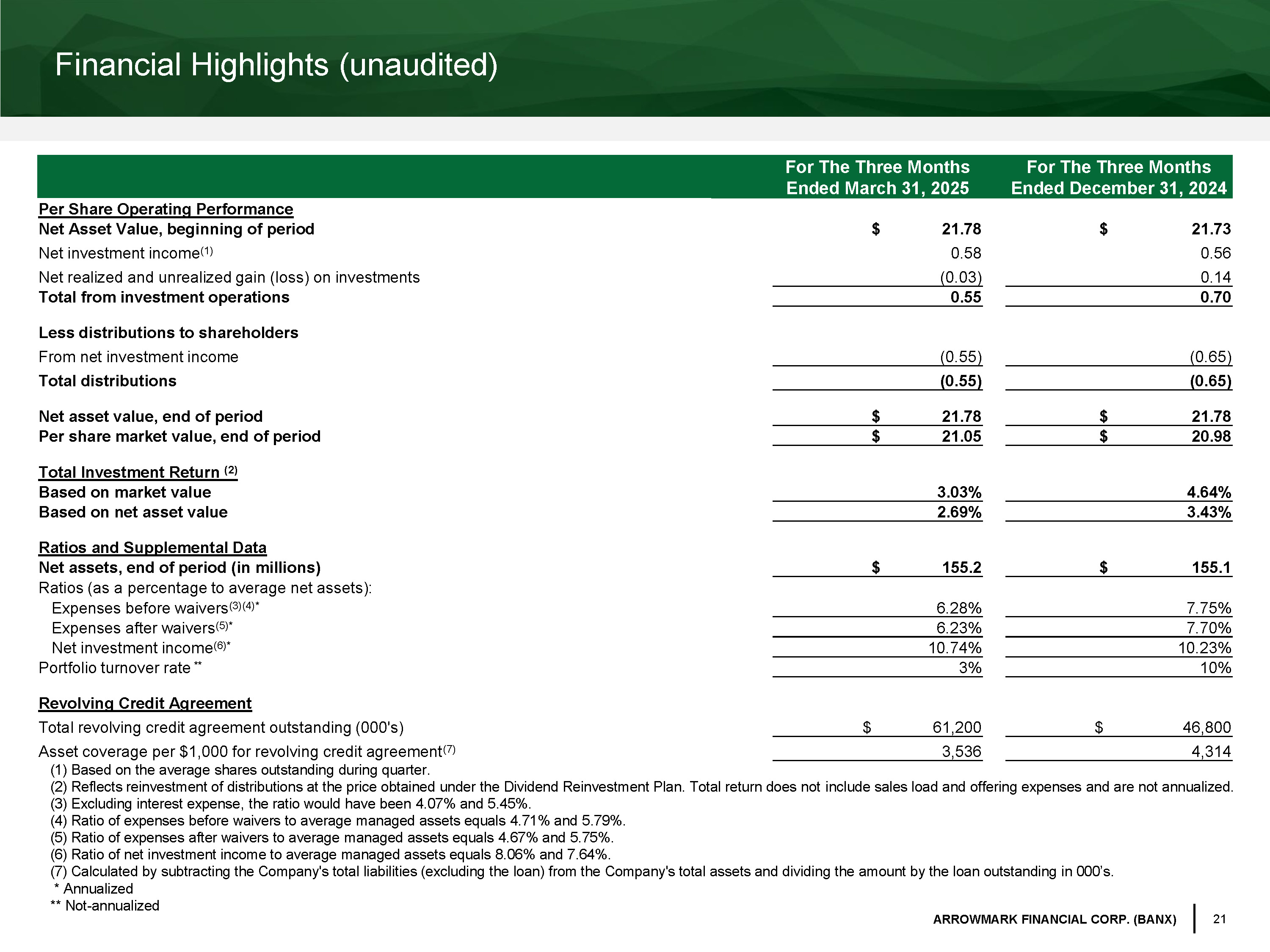 21 ARROWMark Financial CORP.(BANX)截至2025年3月31日止三个月财务摘要(未经审计)截至2024年12月31日止三个月每股经营业绩资产净值,期初$ 21.78 $ 21.73投资净收益(1)0.58 0.56投资已实现和未实现净收益(亏损)(0.03)0.14投资运营合计0.55 0.70减去投资净收益(0.55)(0.65)分配总额(0.55)(0.65)资产净值,期末每股市值$ 21.78 $ 21.78,期末$ 21.05 $ 20.98总投资回报(2)基于市值3.03% 4.64%基于资产净值2.69% 3.43%比率和补充数据净资产,期末(百万)155.2美元155.1美元比率(占平均净资产的百分比):豁免前的费用(3)(4)*6.28% 7.75%豁免后费用(5)*6.23% 7.70%投资净收益(6)*10.74% 10.23%组合换手率**3% 10%循环信贷协议未偿循环信贷协议总额(000 ' s)61,200美元46,800美元循环信贷协议每1,000美元的资产覆盖率(7)3,5364,314(1)基于本季度的平均流通股。(2)反映按股息再投资计划下获得的价格进行分配再投资。总回报不包括销售负荷和发行费用,也不是年化的。(3)若不计利息开支,该比率为4.07%及5.45%。(4)豁免前费用与平均管理资产的比率等于4.71%和5.79%。(5)豁免后的费用与平均管理资产的比率等于4.67%和5.75%。(6)净投资收益与平均管理资产之比等于8.06%和7.64%。(7)按公司总资产减去公司负债总额(不含贷款)除以未偿还贷款000元计算。*年化**未年化
