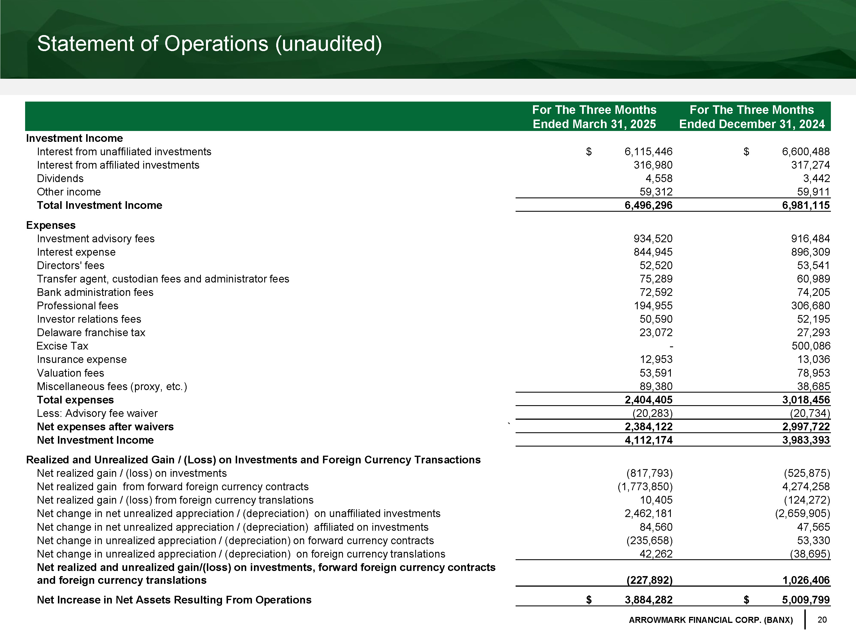 19ARROWMark Financial CORP.(BANX)资产负债表(未经审计)2025年3月31日2024年12月31日资产非关联证券投资,按公允价值(成本:分别为204,428,109美元和196,566,543美元)计算200,485,691美元190,161,944美元关联证券投资,按公允价值计算(成本:分别为14,731,146美元和14,722,831美元)11,330,75011,237,875应收利息和股息3,503,3773,537,456外国现金(成本:567,562美元和243,295美元)567,562243,349现金416,7942,417,838远期货币兑换合同未实现增值83,566263,170预付资产1,002,923352,872总资产217,390,663208,214,504应付负债贷款61,200,00046,800,000应付股息664,628,549应付投资顾问费934,520916,484远期货币兑换合同未实现折旧57,8271,773应付税款-500,086应付应计费用6,617267,818总负债62,199,03153,114,711净资产155,191,633美元155,099,793美元净资产包括:按面值计算的普通股(每股0.00 1美元)7,127美元7,121实收资本156,56每股资产价值:已发行普通股股份7,126,8127,120,782每股普通股资产净值21.78美元21.78美元每股市场价格21.05美元20.98美元市场价格对每股资产净值的溢价/(折价)-3.35 %-3.67 %