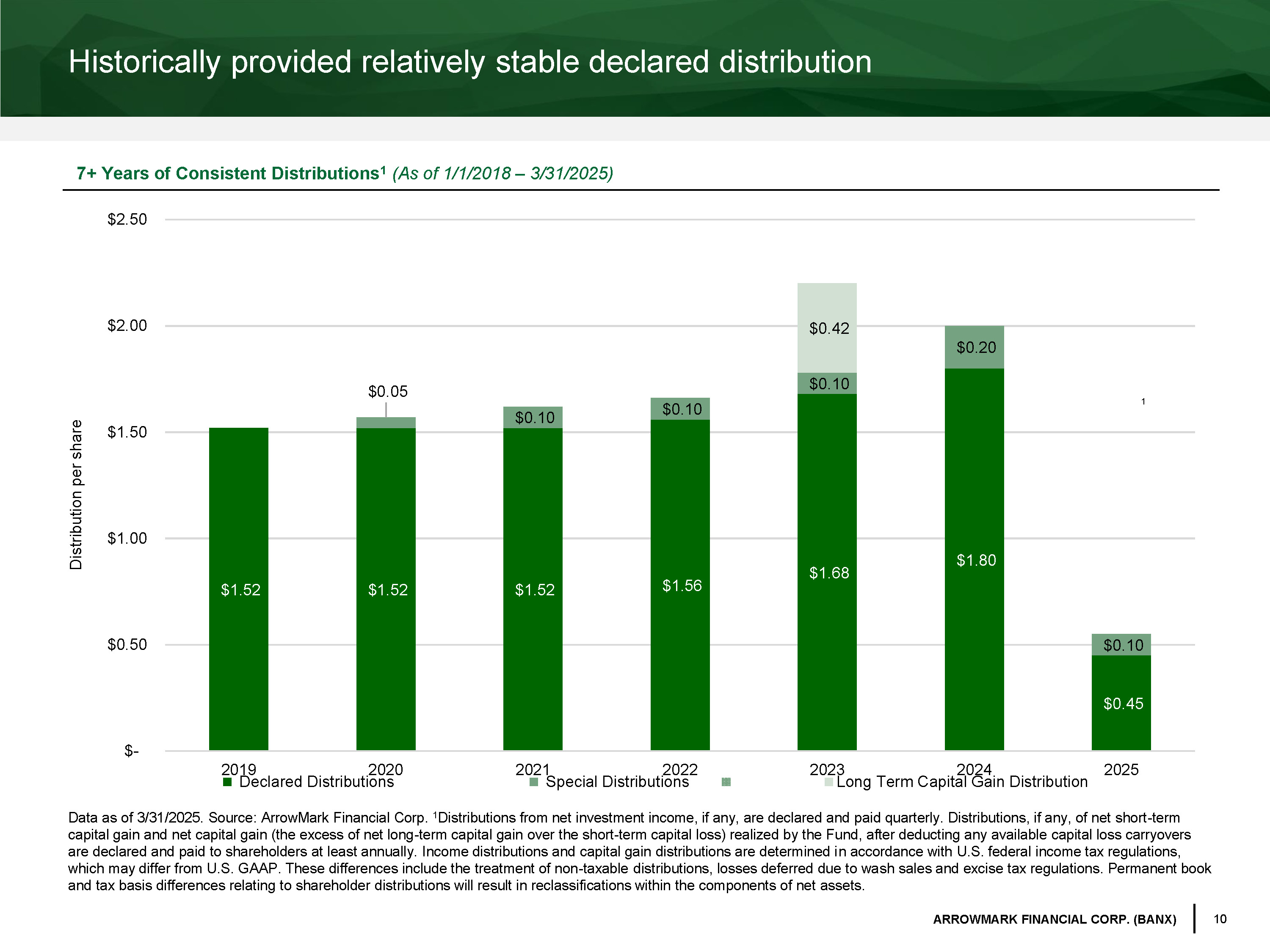 9 ARROWMark Financial CORP.(BANX)BANX通过优质的投资组合NAV和市场价格随时间推移(截至2025年3月31日)产生了相对稳定和一致的NAV基于NAV的总回报(截至2025年3月31日)1年3年5年10年BANX 13.81% 12.05% 13.22% 9.12%彭博综合14.88% 0.52%-0.40 % 1.46%彭博高收益27.69% 4.98% 7.29% 5.01% Dataasof3/31/2025.PastperformanceisnoGuaranteeoffutureresults.arrowMarkFinancialCorp.communcedoperationsonNovember13,2013.Source:BNY,ArrowMark FinancialCorp1彭博美国综合债券指数(“彭博综合”)(包括利息收入)涵盖以美元计价、投资级、固定利率、应税债券市场的SEC注册证券。该指数包括来自财政部、政府机构、企业、附加抵押贷款和资产支持部门的债券。2彭博美国企业高收益指数(“Bloomberg High Yield”)代表以美元计价、非投资级、固定利率、应税企业债券市场。21.78 $ 21.05 $ 0 $ 5 $ 10 $ 15 $ 20 $ 25 $ 3012/31/1312/31/1412/31/1512/31/1612/31/1712/31/1812/31/1912/31/2012/31/2112/31/2212/31/2312/31/24 NAV市场价格