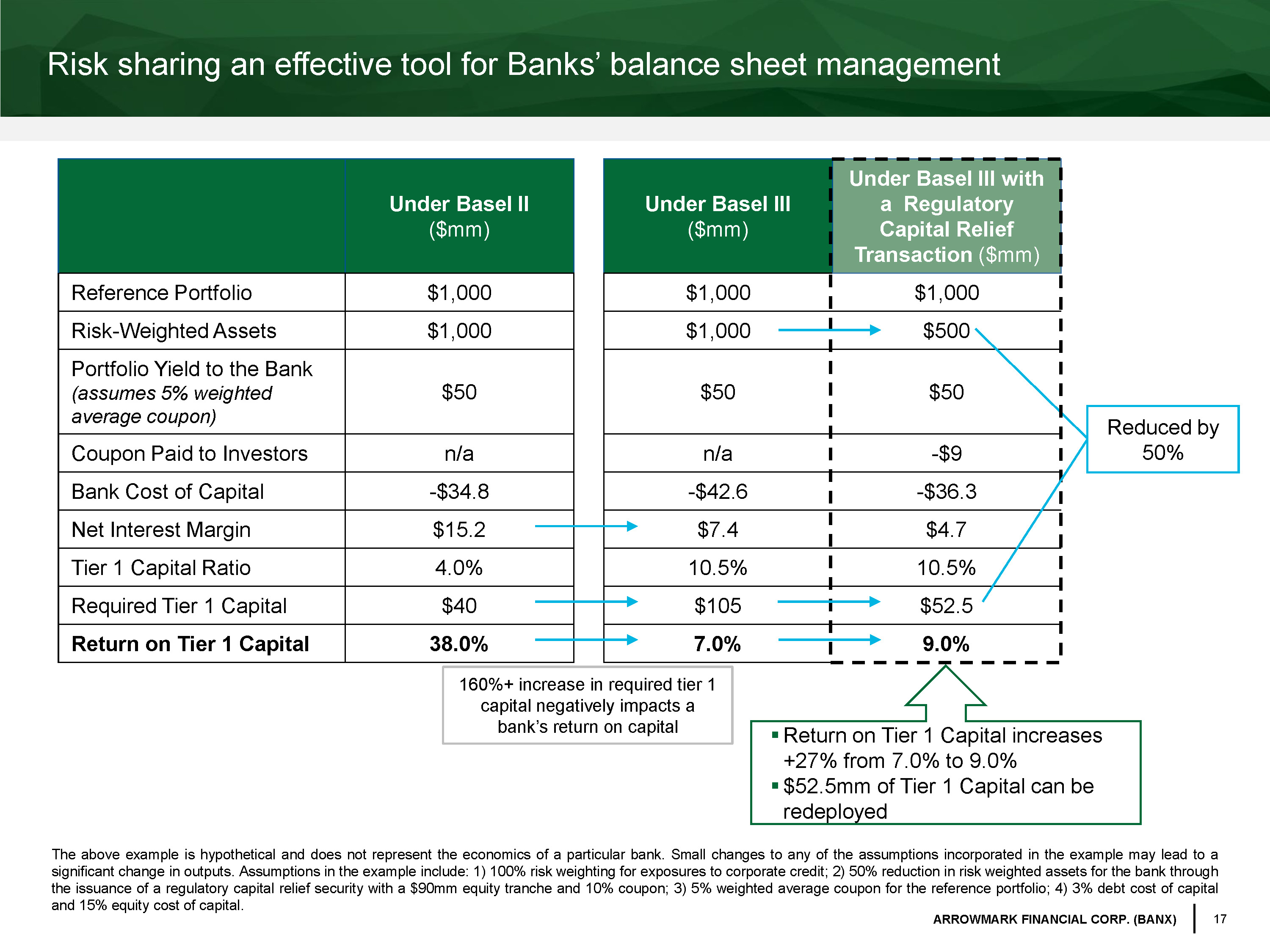 巴塞尔协议II下的17 ARROWMark Finance CORP.(BANX)($ mm)巴塞尔协议III下的($ mm)与监管资本减免交易($ mm)参考投资组合$ 1,000 $ 1,000 $ 1,000风险加权资产$ 1,000 $ 500投资组合对银行的收益率(假设5%加权平均息票)$ 50 $ 50支付给投资者的息票n/a n/a-$ 9银行资本成本-$ 34.8-$ 42.6-$ 36.3净利息差$ 15.2 $ 7.4 $ 4.7一级资本比率4.0% 10.5% 10.5%所需一级资本$ 40 $ 105 $ 52.5一级资本回报率38.0% 7.0% 9.0%风险共担有效工具对于银行的资产负债表管理减少50% 160% +所需一级资本增加负面影响一家银行的资本回报率▪一级资本回报率由7.0%增加+ 27%至9.0%▪52.5mm美元的一级资本可以重新部署上述例子pleishypotheticalanddoesnotrepresenttheeconomicsofaparticularbank。smallchangeestoanyoftheassumptionsincorporatedintheexamplemayleadtoa significantchangeinoutputs。假设包括:1)100% riskweightingforexposurestocorporatecredit;2)50% reductioninriskweightedassetsforthebank通过theissuanceofaregulatorycapitalreliefsecuritywitha $ 90mmequitytranche和10% coupon;3)5% weightedaveragecouponforthereference