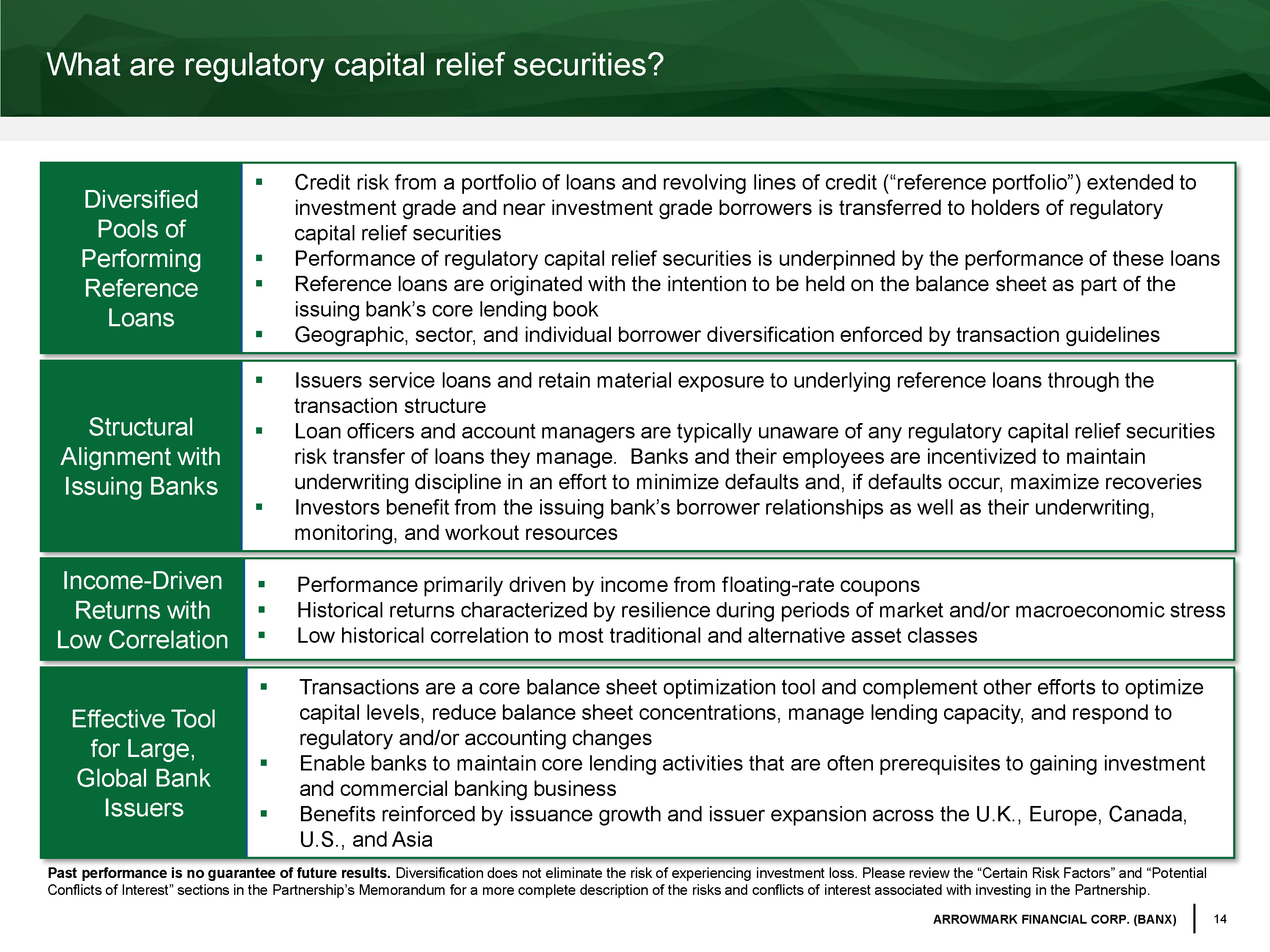 14ARROWMark Financial CORP.(BANX)过去的业绩并不能保证未来的业绩。多元化并不能消除经历投资亏损的风险。请查阅合伙企业备忘录中的“某些风险因素”和“潜在利益冲突”部分,以更完整地描述与投资合伙企业相关的风险和利益冲突。低相关性的收入驱动回报▪业绩主要受浮动利率票息收入驱动▪以市场和/或宏观经济压力时期的韧性为特征的历史回报▪与大多数传统和另类资产类别的历史相关性较低表现参考贷款的多元化池▪来自贷款和循环信贷额度组合(“参考组合”)的信用风险扩展至投资级和接近投资级别的借款人被转让给监管资本减免证券的持有人▪监管资本减免证券的表现受到这些贷款表现的支撑▪参考贷款的发起意图是作为发行银行核心贷款账簿的一部分在资产负债表上持有▪地理,部门,交易准则强制实施的个人借款人多元化与发行银行的结构一致性▪发行人为贷款提供服务,并通过交易结构保留对基础参考贷款的重大风险敞口▪信贷员和客户经理通常不知道他们管理的贷款有任何监管资本减免证券风险转移。银行及其员工被激励保持承保纪律,努力将违约降至最低,如果发生违约,则最大限度地追偿▪投资者受益于发行银行的借款人关系以及他们的承销、监控和锻炼资源,这是大型、全球性银行发行人的有效工具▪交易是一种核心的资产负债表优化工具,与其他优化资本水平、降低资产负债表集中度、管理放贷能力的努力相辅相成,并应对监管和/或会计变更▪使银行能够维持核心贷款活动,这些活动通常是获得投资和商业银行业务的先决条件▪英国、欧洲、加拿大、美国和亚洲的发行增长和发行人扩张强化了收益什么是监管资本减免证券?