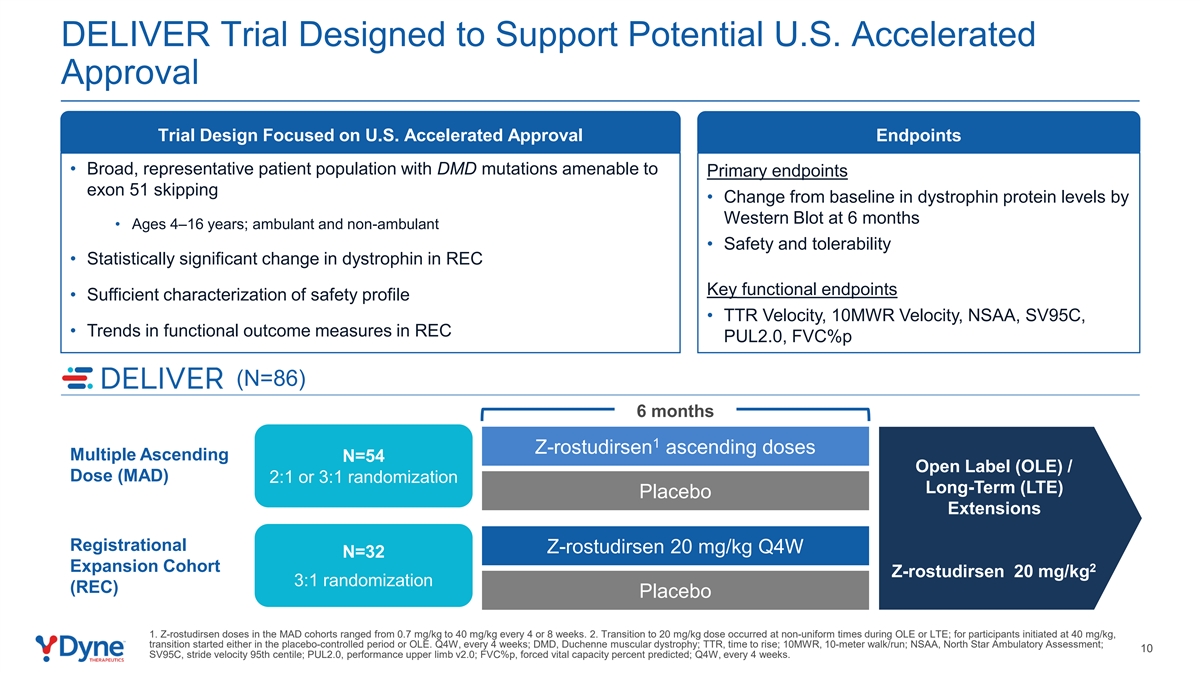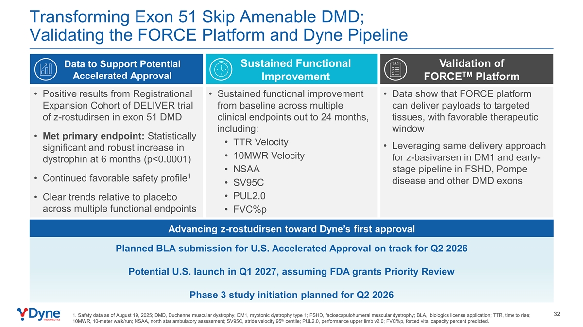 转换外显子51跳过可适应的DMD;验证FORCE平台和DYNE管道数据,以支持TM加速批准改进FORCE平台的潜在持续功能验证•注册的积极结果•持续的功能改进•数据显示,DELIVER试验的FORCE平台扩展队列从基线跨多个可以向外显子51 DMD临床终点中的Z-rostudirsen靶向递送有效载荷,直至24个月,组织,具有有利的治疗方法,包括:窗口•达到主要终点:统计上• TTR速度•利用相同的递送方法显着而强劲地增加• 6个月时Z-basivarsen在DM1和早期肌营养不良蛋白中的10MWR速度(p < 0.0001)• FSHD、Pompe1中的NSAA阶段管道•持续有利的安全性特征疾病和其他DMD外显子• SV95C • PUL2.0 •在多个功能终点上相对于安慰剂的明确趋势• FVC % p推进z-rostudirsen向Dyne的首次批准计划BLA提交美国加速批准,美国可能在2027年第一季度推出,假设FDA批准计划于2026年第二季度启动的优先审评3期研究41。截至2025年8月19日的安全性数据;DMD,杜氏肌营养不良症;DM1,强直性肌营养不良症1型;FSHD,面肩肱肌营养不良症;BLA,生物制剂许可申请;TTR,时间上升;th 10MW,10米步行/跑步;NSAA,北极星动态评估;SV95C,步速95百分位;PUL2.0,性能上肢v2.0;FVC p,强迫肺活量百分比预测。