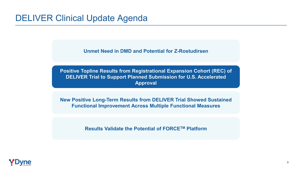 DELIVER临床更新议程未满足DMD方面的需求和DELIVER试验注册扩展队列(REC)中Z-Rostudirsen阳性顶线结果的潜力,以支持计划提交美国加速批准DELIVER试验的新阳性长期结果显示跨多个功能措施的持续功能改善TM结果验证了FORCE平台的潜力9