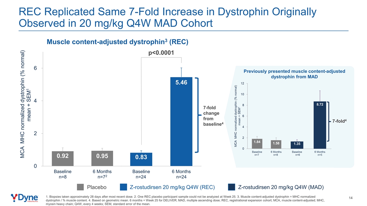 REC复制了最初在20 mg/kg Q4W MAD队列中观察到的同样7倍的肌营养不良蛋白增加3肌肉含量调节抗肌萎缩蛋白(REC)p < 0.0001 6先前从MAD 5.46出现肌肉含量调节抗肌萎缩蛋白47倍变化4 7倍4基线20.92 0.95 0.830基线6个月基线6个月2 n = 8 n = 7 n = 24 n = 24安慰剂Z-rostudirsen 20 mg/kg Q4W(REC)Z-rostudirsen 20 mg/kg Q4W(MAD)1。最近一次给药后大约28天进行的活检。2.第25周无法分析1个REC安慰剂参与者样本。3.肌肉含量调节抗肌萎缩蛋白= MHC正常化14抗肌萎缩蛋白/%肌肉含量。4.基于几何均值。6个月=第25周交付;MAD,多次递增剂量;REC,注册扩展队列;MCA,肌肉含量调整;MHC,肌球蛋白重链;Q4W,每4周一次;SEM,均值标准误差。MCA MHC正常化抗肌萎缩蛋白(%正常)1均值+ SEM