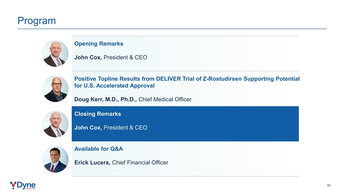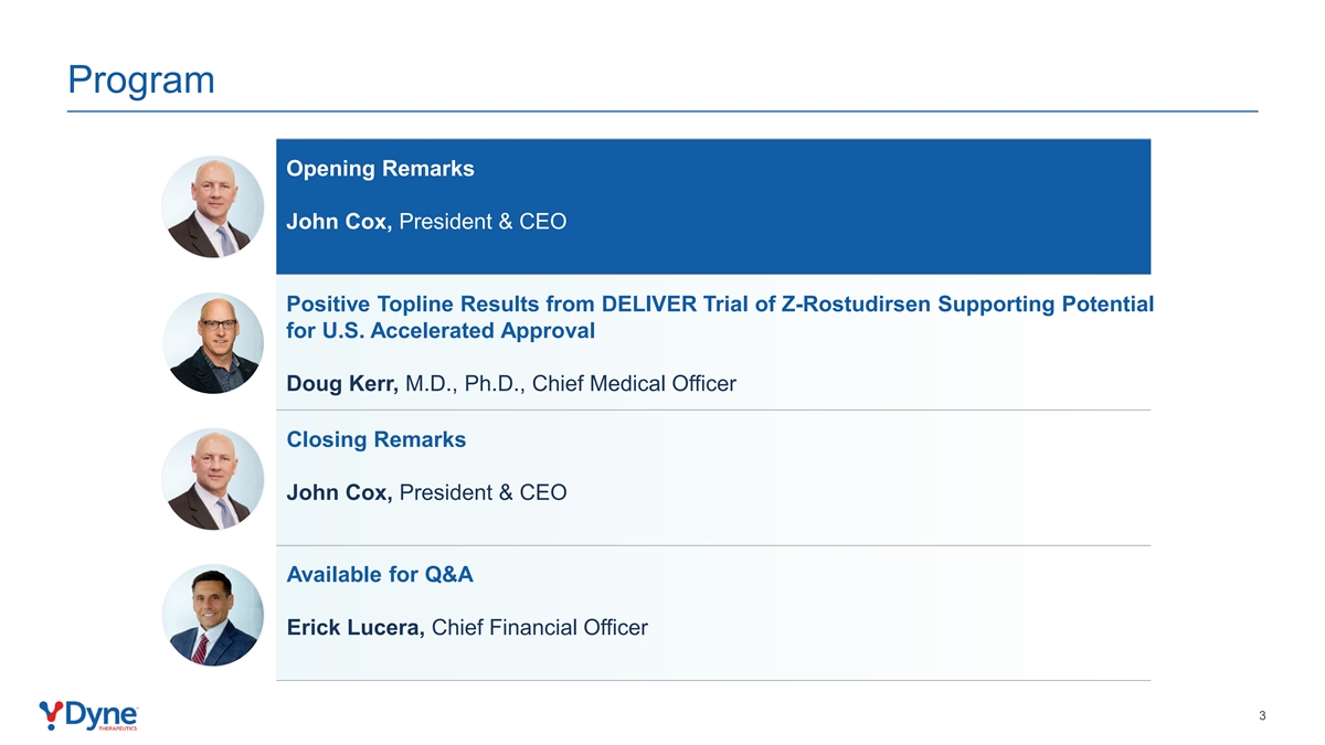 项目开场白:Z-Rostudirsen的DELIVER试验获得积极的顶线结果,支持美国加速批准的潜力Doug Kerr,医学博士,首席医疗官结束语:总裁兼首席执行官John Cox可问答Erick Lucera,首席财务官 3