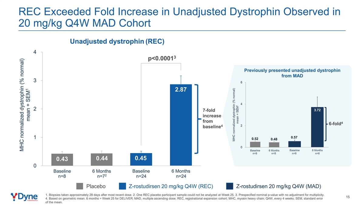 REC在20 mg/kg Q4W MAD队列中观察到的未调整肌营养不良蛋白增加超过2倍未调整肌营养不良蛋白(REC)43 p < 0.0001先前从MAD3出现的未调整肌营养不良蛋白2.87 27倍从46倍4基线10.45 0.44 0.430基线6个月基线6个月2 n = 8 n = 7 n = 24 n = 24安慰剂Z-rostudirsen 20 mg/kg Q4W(REC)Z-rostudirsen 20 mg/kg Q4W(MAD)1。最近一次给药后大约28天进行的活检。2.第25周无法分析1个REC安慰剂参与者样本。3.预指定的标称p值,没有对多重性进行调整。15 4.基于几何均值。6个月=第25周交付;MAD,多次递增剂量;REC,注册扩展队列;MHC,肌球蛋白重链;Q4W,每4周一次;SEM,均值标准误差。MHC正常化抗肌萎缩蛋白(%正常)1均值+ SEM