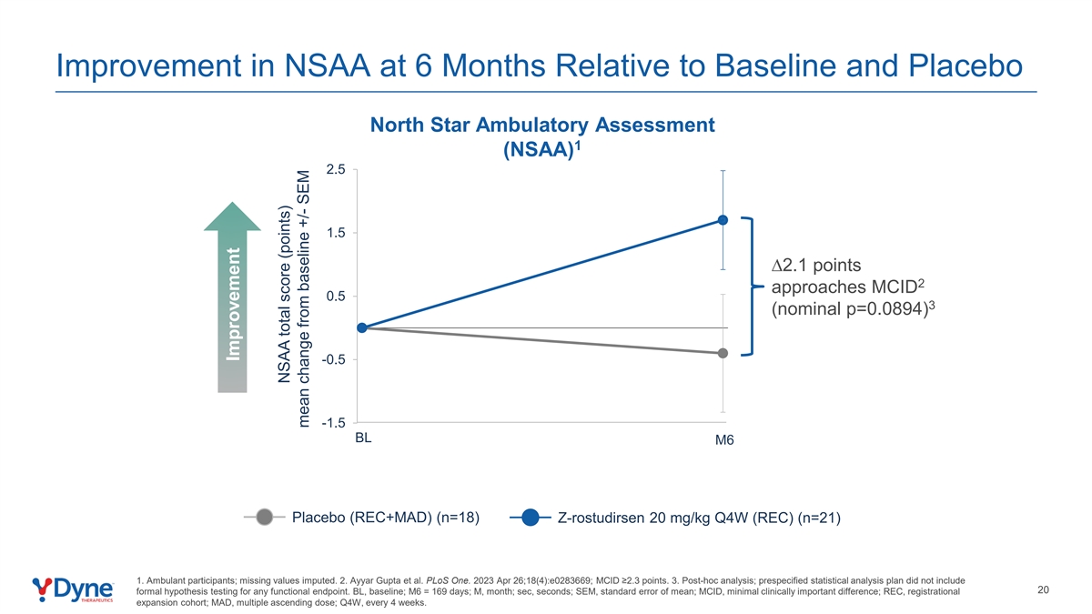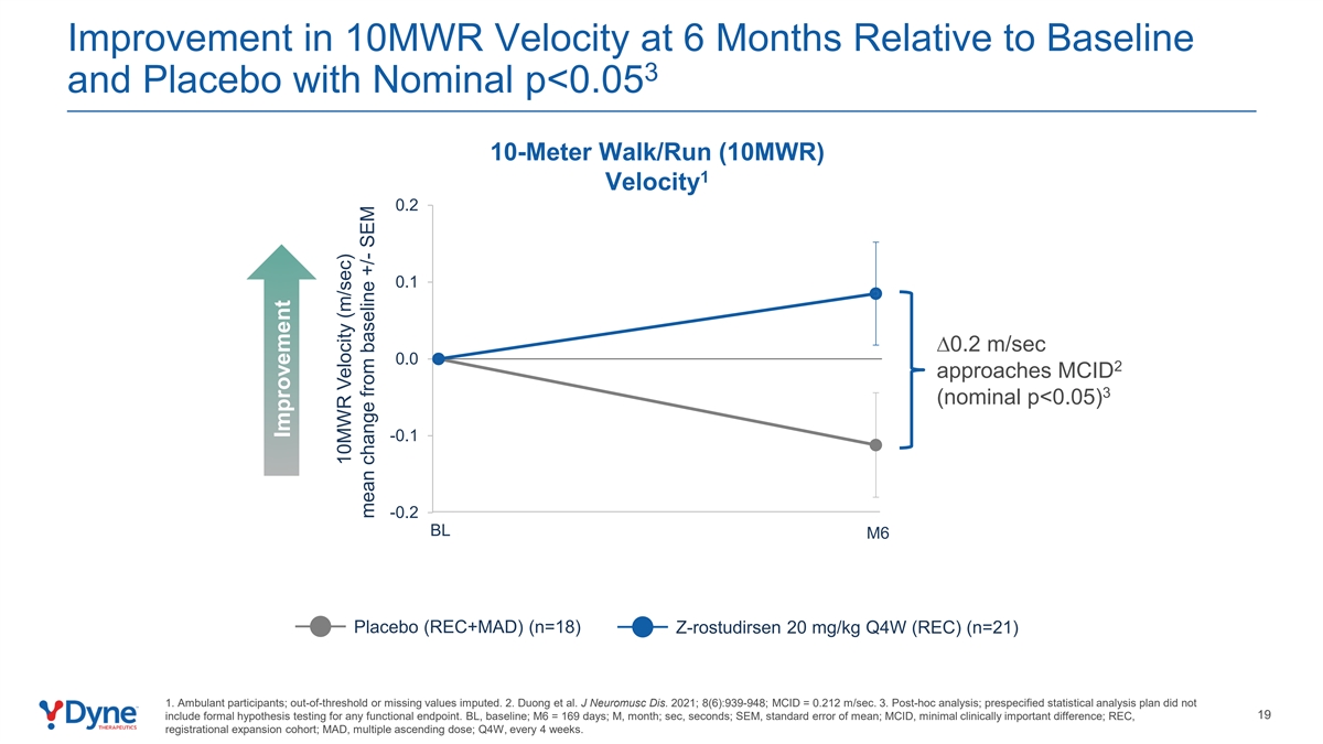 10MWR速度在6个月时相对于基线3和安慰剂的改善,标称p < 0.05 10米步行/跑步(10MWR)1速度0.2 0.1Ø 0.2米/秒0.02接近MCID 3(标称p < 0.05)-0.1-0.2 BL M6安慰剂(REC + MAD)(n = 18)Z-rostudirsen 20 mg/kg Q4W(REC)(n = 21)1。救护车参与者;超阈值或缺失值估算。2.Duong et al. J Neuromusc DIS。2021;8(6):939-948;MCID = 0.212米/秒。3。事后分析;预先指定的统计分析计划没有19包括任何功能终点的正式假设测试。BL,基线;M6 = 169天;M,月;sec,秒;SEM,均值标准误差;MCID,最小临床重要差异;REC,注册扩展队列;MAD,多次递增剂量;Q4W,每4周一次。改善10MWR速度(m/sec)较基线平均变化+/-SEM