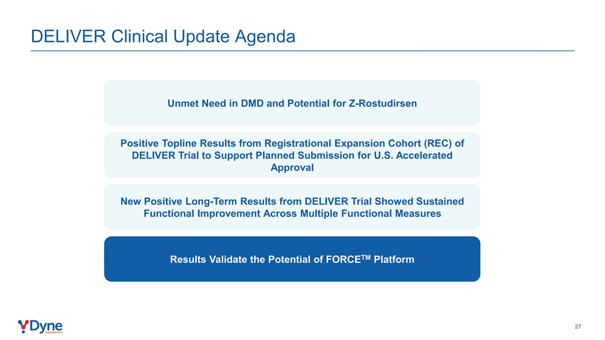 DELIVER临床更新议程未满足DMD方面的需求和DELIVER试验注册扩展队列(REC)中Z-Rostudirsen阳性顶线结果的潜力,以支持计划提交美国加速批准DELIVER试验的新阳性长期结果显示跨多个功能措施的持续功能改善TM结果验证了FORCE平台的潜力27