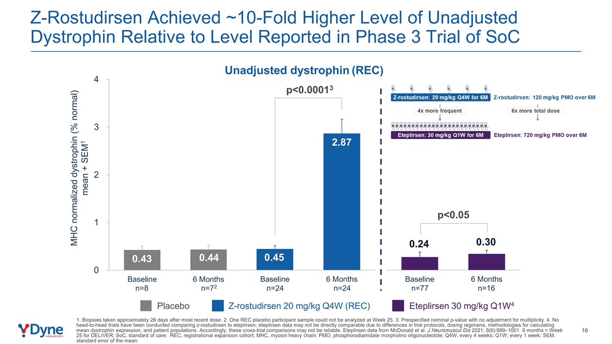 Z-Rostudirsen的未调整肌营养不良蛋白水平相对于SoC未调整肌营养不良蛋白(REC)3期试验报告的水平高出约10倍43 p < 0.000132.872 p < 0.05 10.30 0.24 0.44 0.45 0.430基线6个月基线6个月基线6个月基线2 n = 8 n = 7 n = 24 n = 24 n = 77 n = 164安慰剂Z-rostudirsen 20 mg/kg Q4W(REC)Eteplirsen 30 mg/kg Q1W 1。最近一次给药后大约28天进行的活检。2.第25周无法分析1个REC安慰剂参与者样本。3.预指定的标称p值,没有对多重性进行调整。4.没有进行比较z-rostudirsen和eteplirsen的头对头试验;由于试验方案、给药方案、计算平均抗肌萎缩蛋白表达的方法和患者群体的差异,eteplirsen数据可能无法直接进行比较。因此,这些跨审判比较可能并不可靠。Eteplirsen数据来自McDonald et al. J Neuromuscul DIS 2021;8(6):989 – 1001。6个月=第16周25为DELIVER;SOC,护理标准;REC,注册扩增队列;MHC,肌球蛋白重链;PMO,二氨酸磷酯吗啉基寡核苷酸;Q4W,每4周;Q1W,每1周;SEM,均值标准误差。MHC正常化抗肌萎缩蛋白(%正常)1均值+ SEM