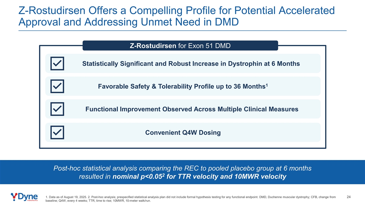Z-Rostudirsen为潜在的加速批准和解决DMD中未满足的需求提供了令人信服的配置文件Z-Rostudirsen用于外显子51 DMD在6个月时具有统计学意义和强劲的肌营养不良蛋白增加1有利的安全性和耐受性配置文件在多个临床措施中观察到的长达36个月的功能改善方便的Q4W给药事后统计分析比较REC与6个月时的合并安慰剂组2导致TTR速度和10MWR速度1的名义p < 0.05。数据截至2025年8月19日。2.事后分析;预先指定的统计分析计划不包括任何功能终点的正式假设测试。DMD,杜氏肌营养不良症;CFB,较24基线变化;Q4W,4周一次;TTR,上升时间;10MW,10米步行/跑步。