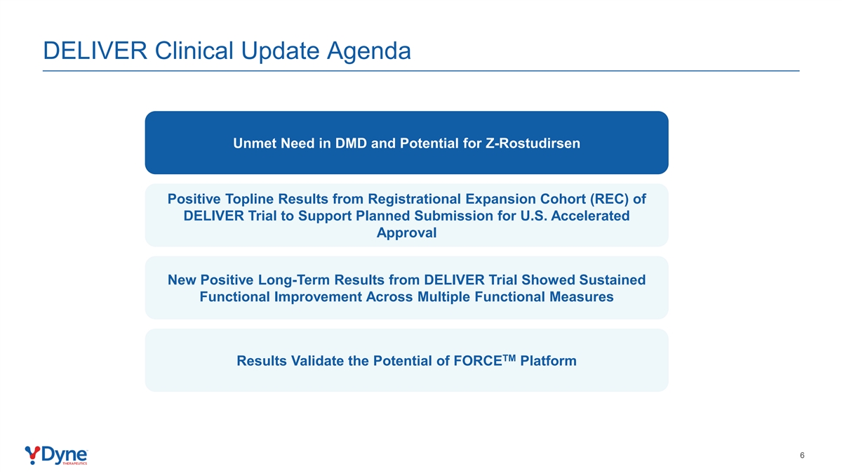 DELIVER临床更新议程未满足DMD方面的需求和DELIVER试验注册扩展队列(REC)中Z-Rostudirsen阳性顶线结果的潜力,以支持计划提交美国加速批准DELIVER试验的新阳性长期结果显示跨多个功能措施的持续功能改善TM结果验证了FORCE平台6的潜力