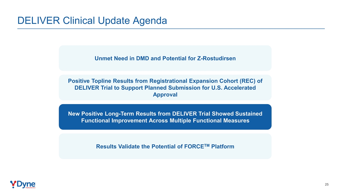 DELIVER临床更新议程未满足DMD方面的需求和DELIVER试验注册扩展队列(REC)中Z-Rostudirsen阳性顶线结果的潜力,以支持计划提交美国加速批准DELIVER试验的新阳性长期结果显示跨多个功能措施的持续功能改善TM结果验证了FORCE平台的潜力25