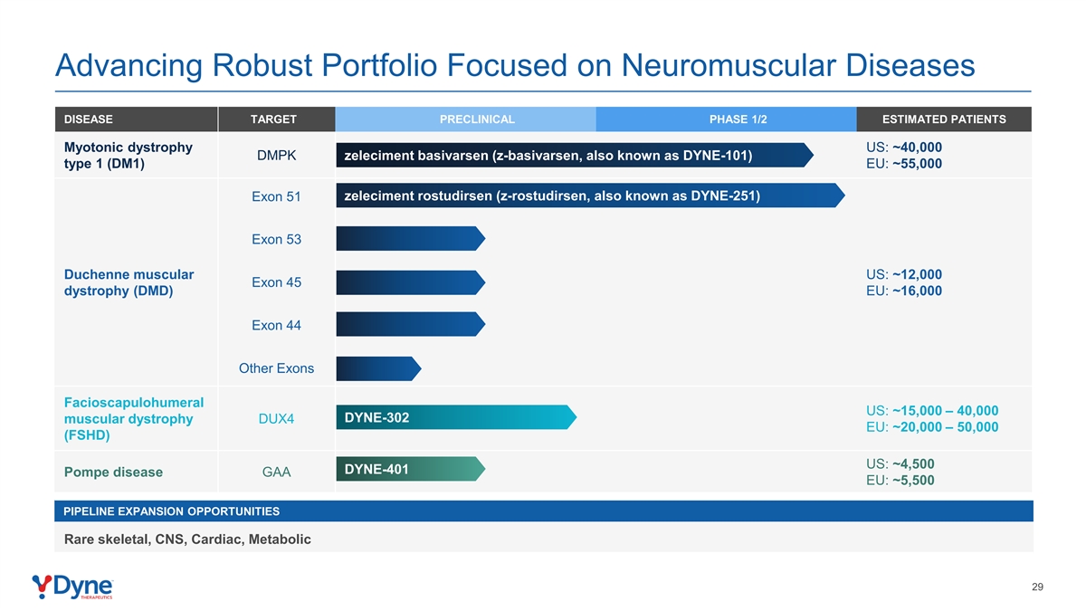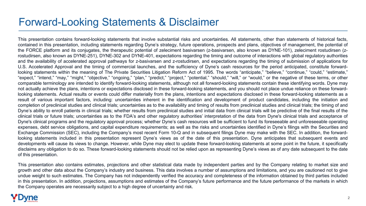 前瞻性陈述&免责声明本演示文稿包含涉及重大风险和不确定性的前瞻性陈述。除历史事实陈述外,本演示文稿中包含的所有陈述,包括有关达因战略、未来运营、前景和计划、管理目标、FORCE平台及其偶联物的潜力、zeleciment basivarsen(z-basivarsen,又称DYNE-101)、zeleciment rostudirsen(z-rostudirsen,又称DYNE-251)、DYNE-302和DYNE-401的治疗潜力的陈述,关于与全球监管机构互动的时间和结果的预期,以及z-basivarsen和z-rostudirsen加速批准途径的可用性,以及关于提交美国加速批准申请的时间和商业发射时间的预期,以及达因在预期期间的现金资源充足,构成1995年《私人证券诉讼改革法案》含义内的前瞻性陈述。“预期”、“相信”、“继续”、“可能”、“估计”、“预期”、“打算”、“可能”、“可能”、“目标”、“正在进行”、“计划”、“预测”、“项目”、“潜在”、“应该”、“将”或“将”等词语或这些术语的否定词或其他类似术语旨在识别前瞻性陈述,尽管并非所有前瞻性陈述都包含这些识别词。达因可能无法实际实现这些前瞻性陈述中披露的计划、意图或预期,您不应过分依赖这些前瞻性陈述。由于各种重要因素,实际结果或事件可能与这些前瞻性陈述中披露的计划、意图和预期存在重大差异,这些因素包括:确定和开发候选产品所固有的不确定性,包括启动和完成临床前研究和临床试验;临床前研究和临床试验结果的可得性和时间的不确定性;临床试验的时间和达因招募患者的能力;临床前研究的结果和临床试验的初步数据是否将预测临床试验或未来试验的最终结果;FDA和其他监管机构对达因临床试验数据的解释和接受达因临床项目的不确定性以及监管批准程序;达因的现金资源是否足以支付其可预见和不可预见的运营费用、偿债义务和资本支出要求;以及达因向美国证券交易委员会(SEC)提交的文件中确定的风险和不确定性,包括公司最近的10-Q表格以及随后达因可能向SEC提交的文件。此外,本演示文稿中包含的前瞻性陈述代表了达因截至本演示文稿发布之日的观点。达因预计,随后的事件和发展将导致其观点发生变化。然而,尽管达因可能会选择在未来某个时候更新这些前瞻性陈述,但它明确表示不承担这样做的任何义务。这些前瞻性陈述不应被视为代表达因在本演示文稿日期之后的任何日期的观点。本演示文稿还包含独立方和公司就市场规模和增长做出的估计、预测和其他统计数据以及有关公司行业和业务的其他数据。这些数据涉及许多假设和限制,请注意不要对这些估计给予不应有的权重。公司未对本演示文稿中包含的第三方获取的信息的准确性和完整性进行独立验证。此外,对公司未来业绩的预测、假设和估计以及公司经营所在市场的未来业绩必然具有高度的不确定性和风险性。2