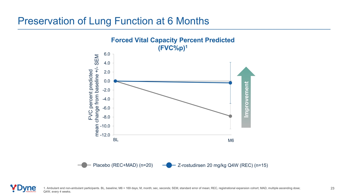 6个月时肺功能的保存强制生命容量百分比预测1(FVC丨% p)6.04.0 2.0 0.0-2.0-4.0-6.0-8.0-10.0-12.0 BL M6安慰剂(REC + MAD)(n = 20)Z-rostudirsen 20 mg/kg Q4W(REC)(n = 15)1。救护车和非救护车参与者。BL,基线;M6 = 169天;M,月;秒,秒;SEM,均值标准误差;REC,注册扩展队列;MAD,多次递增剂量;23Q4,每4周一次。FVC百分比预测较基线的平均变化+/-SEM改善