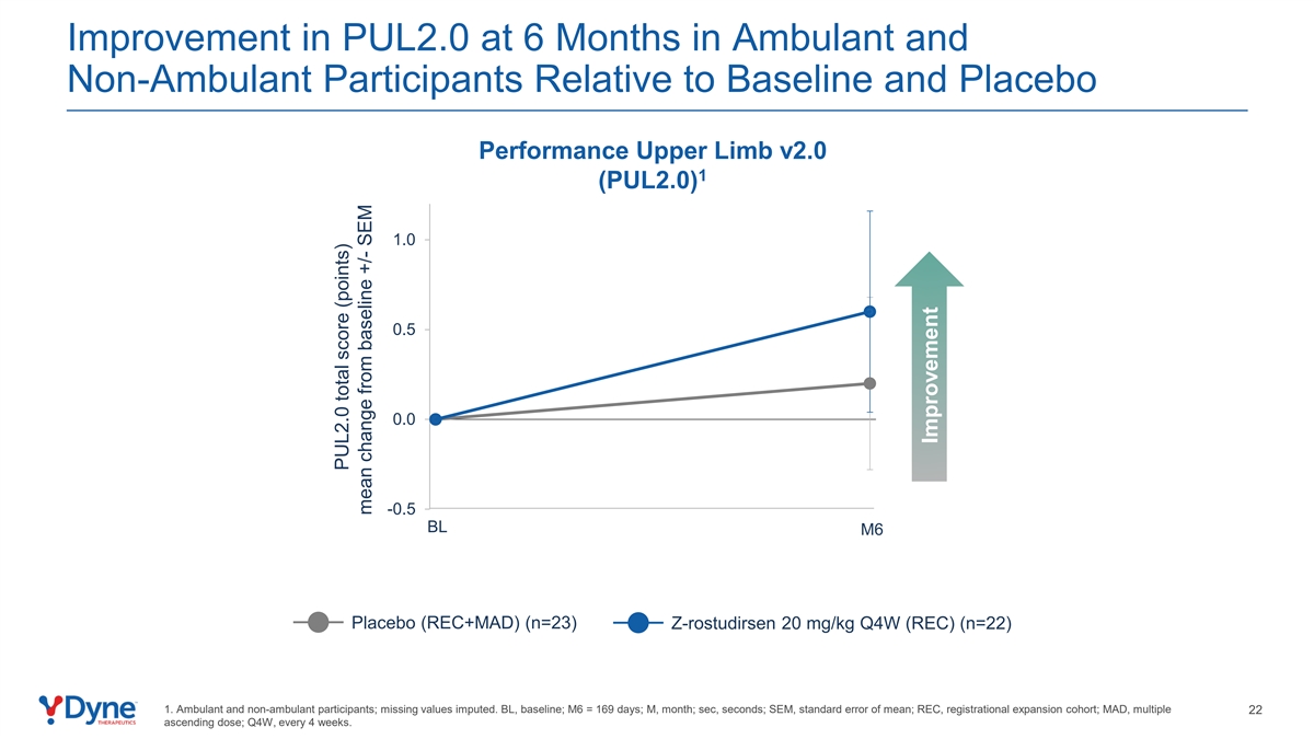救护车和非救护车参与者在6个月时PUL2.0相对于基线和安慰剂性能上肢v2.0 1(PUL2.0)1.0 0.5 0.0-0.5 BL M6安慰剂(REC + MAD)(n = 23)Z-rostudirsen 20 mg/kg Q4W(REC)(n = 22)1的改善。救护车和非救护车参与者;估算的缺失值。BL,基线;M6 = 169天;M,月;sec,秒;SEM,均值标准误差;REC,注册扩展队列;MAD,多次22递增剂量;Q4W,每4周一次。PUL2.0总分(分)较基线平均变化+/-SEM改善