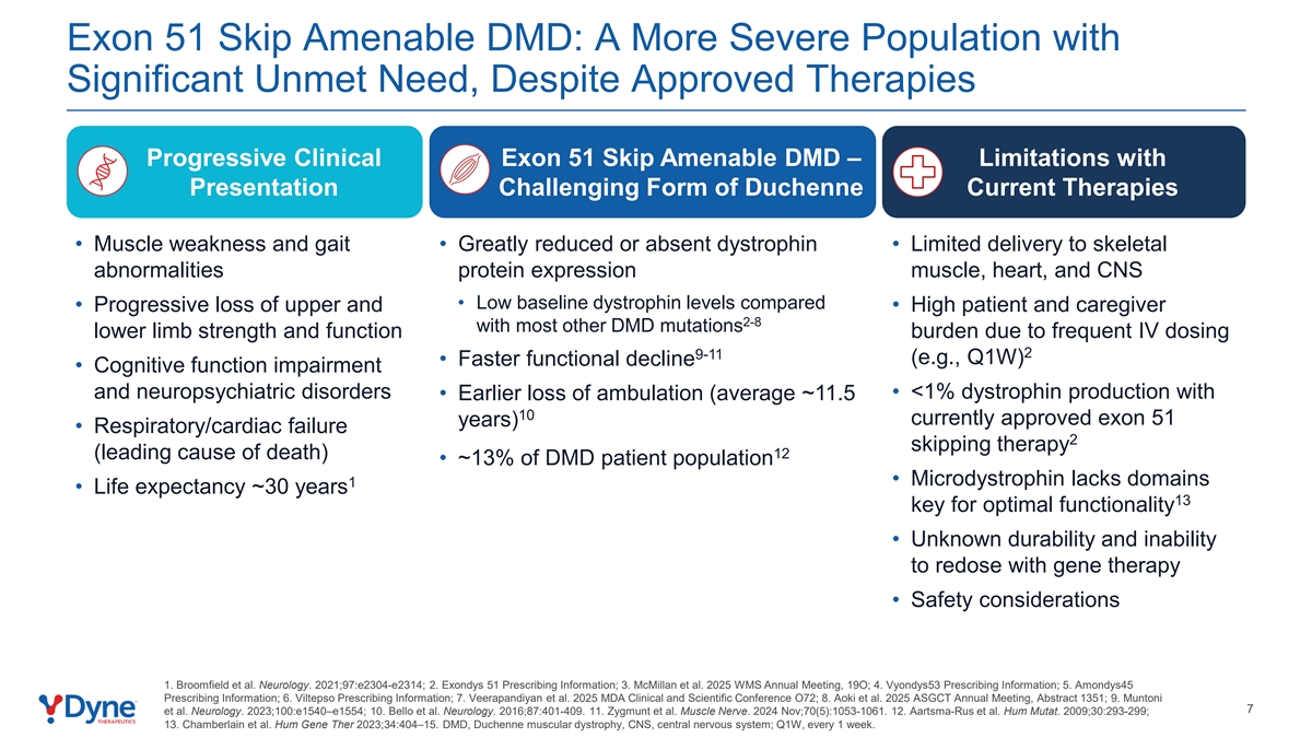 外显子51 Skip Amable DMD:更严重的人群,尽管已批准治疗,但仍有明显未满足的需求渐进性临床外显子51 Skip Amable DMD – Duchenne当前疗法的呈现挑战形式的局限性•肌肉无力和步态•抗肌萎缩蛋白大大减少或不存在•对骨骼异常的递送有限蛋白质表达肌肉、心脏和中枢神经系统•比较低的基线抗肌萎缩蛋白水平•由于频繁的静脉给药2 9-11(例如,Q1W)•更快的功能衰退•认知功能障碍和神经精神障碍•<1%的抗肌萎缩蛋白生成伴•更早丧失行走能力(平均~11.5 10目前批准的外显子51年)•呼吸/心力衰竭2跳过治疗(主要死亡原因)12 •~13%的DMD患者群体•微肌萎缩蛋白缺乏领域1 •预期寿命~30岁13最佳功能的关键•未知的持久性和无法用基因疗法重新给药•安全性考虑1。布鲁姆菲尔德等人,神经病学。2021;97:e2304-e2314;2。Exondys 51处方信息;3。McMillan et al. 2025 WMS年会,19O;4。Vyondys53处方信息;5。Amondys45处方信息;6。Viltepso处方信息;7。Veerapandiyan等人2025年MDA临床与科学会议O72;8。Aoki et al. 2025ASGCT年会,Abstract 1351;9。Muntoni 7 et al. Neurology。2023;100:e1540 – e1554;10。Bello等人,神经病学。2016;87:401-409.11.Zygmunt等人。肌肉神经。2024年11月;70(5):1053-1061。12.Aartsma-Rus等人Hum Mutat。2009;30:293-299; 13.Chamberlain et al. Hum Gene Ther 2023;34:404 – 15。DMD,杜氏肌营养不良症,CNS,中枢神经系统;Q1W,1周一次。