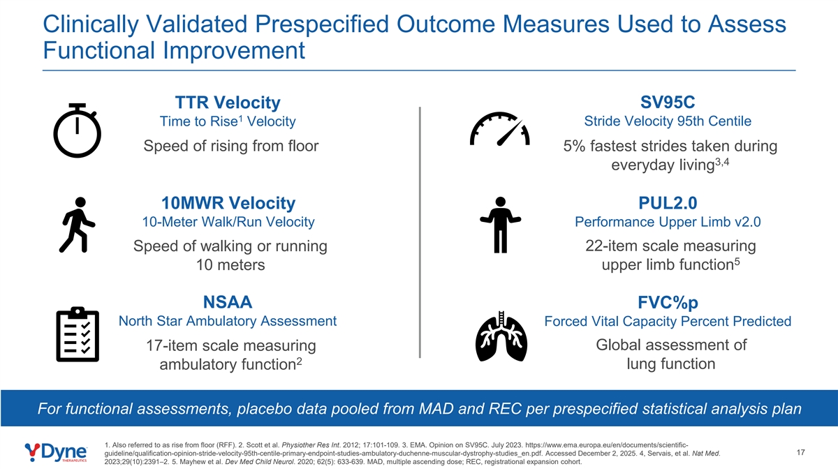 经临床验证的用于评估功能改善的预设结果措施TTR速度SV95C 1跨步速度第95个百分位上升速度从楼层上升的速度3、4日常生活期间采取的最快步幅5% 10MWR速度PUL2.0 10米步行/跑步速度性能上肢v2.0步行或跑步速度22项量表测量5 10米上肢功能NSAA丨% p北极星动态评估强制生命容量百分比预测17项量表测量2肺功能动态功能的全球评估,根据预先指定的统计分析计划1从MAD和REC汇集的安慰剂数据。也被称为从地板上升(RFF)。2.Scott et al. Physiother Res Int。2012; 17:101-109.3.EMA。关于SV95C的意见。2023年7月。https://www.ema.europa.eu/en/documents/scientific-17 guideline/qualification-opinion-stride-velocity-95th-centile-primary-endpoint-studies-ambulatory-duchenne-muscular-dystrophy-studies_en.pdf。于2025年12月2日访问。4,Servais,et al. Nat Med. 2023;29(10):2391 – 2。5.Mayhew et al. Dev Med Child Neurol。2020; 62(5): 633-639.MAD,多次递增剂量;REC,注册扩展队列。