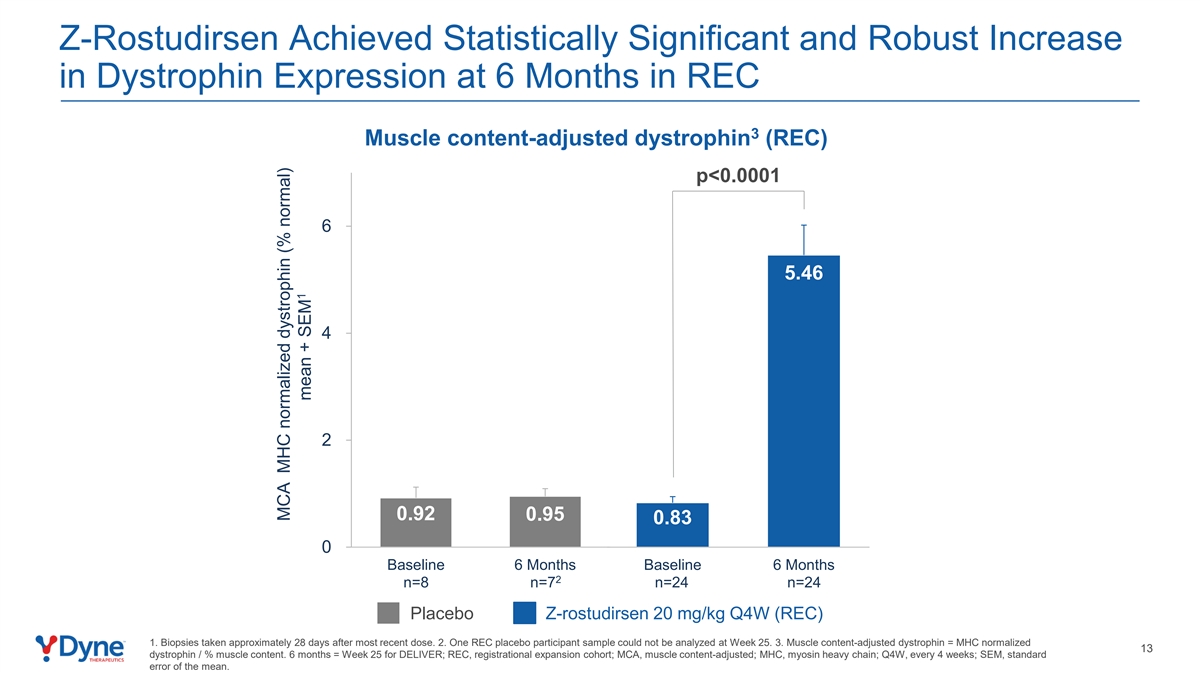 Z-Rostudirsen在REC3肌肉含量调节抗肌萎缩蛋白(REC)p < 0.000165.46 420.92 0.95 0.830基线6个月基线6个月基线2 n = 8 n = 7 n = 24 n = 24安慰剂Z-rostudirsen 20 mg/kg Q4W(REC)1中实现了具有统计学意义和稳健的肌营养不良蛋白表达增加。最近一次给药后大约28天进行的活检。2.第25周无法分析1个REC安慰剂参与者样本。3.肌肉含量调节抗肌萎缩蛋白= MHC正常化13抗肌萎缩蛋白/%肌肉含量。6个月=第25周交付;REC,注册扩展队列;MCA,肌肉含量调整;MHC,肌球蛋白重链;Q4W,每4周一次;SEM,均值标准误差。MCA MHC正常化抗肌萎缩蛋白(%正常)1均值+ SEM
