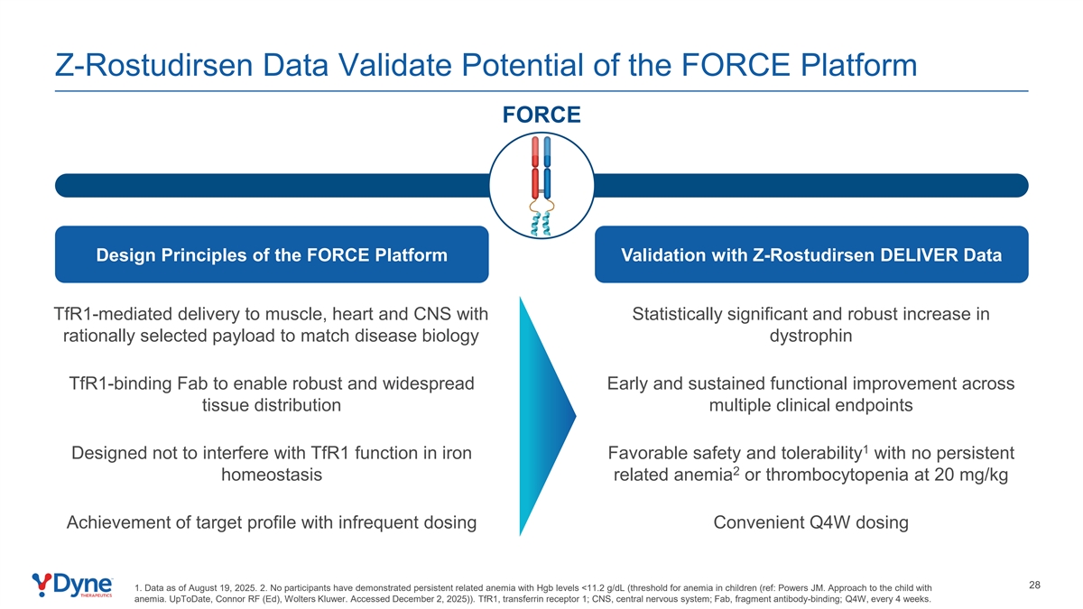 Z-Rostudirsen数据验证FORCE平台的潜力FORCE平台设计原则通过Z-Rostudirsen交付数据验证TFR1介导的肌肉、心脏和中枢神经系统递送,合理选择的有效载荷具有统计学意义和稳健的增加,以匹配疾病生物学抗肌萎缩蛋白TFR1结合晶圆厂,从而能够实现跨组织分布的稳健和广泛的早期和持续功能改善多个临床终点1旨在不干扰铁中TFR1功能的良好安全性和耐受性,在20mg/kg时没有持续的2稳态相关贫血或血小板减少症。在不频繁给药的情况下实现目标谱方便的Q4W给药281。数据截至2025年8月19日。2.没有参与者表现出HGB水平< 11.2 g/dL(儿童贫血阈值(ref:Powers JM。接诊贫血患儿。UpToDate,Connor RF(Ed),Wolters Kluwer。2025年12月2日访问))。TFR1,转铁蛋白受体1;CNS,中枢神经系统;FAB,片段抗体结合;Q4W,4周一次。