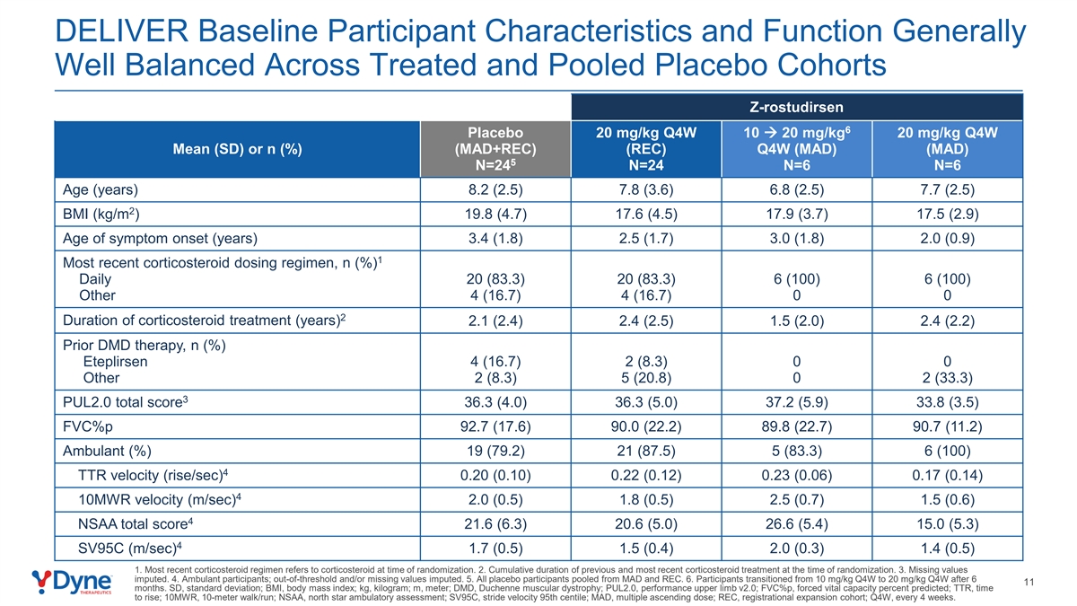 Deliver基线参与者的特征和功能在接受治疗和合并的安慰剂队列Z-rostudirsen 6安慰剂20 mg/kg Q4W 10 à 20 mg/kg 20 mg/kg Q4W均值(SD)或n(%)(MAD + REC)(REC)Q4W(MAD)(MAD)5 n = 24 n = 24 n = 6 n = 6年龄(岁)8.2(2.5)7.8(3.6)6.8(2.5)7.7(2.5)2 BMI(kg/m)19.8(4.7)17.6(4.5)17.9(3.7)17.5(2.9)发病年龄(岁)3.4(1.8)2.5(1.7)3.0(1.8)2.0(0.9)1最近的皮质类固醇给药方案n(%)每日20(83.3)20(83.3)6(100)6(100)其他4(16.7)4(16.7)002皮质类固醇治疗持续时间(年)2.1(2.4)2.4(2.5)1.5(2.0)2.4(2.2)既往DMD治疗,n(%)Eteplirsen 4(16.7)2(8.3)00其他2(8.3)5(20.8)02(33.3)3 PUL2.0总分36.3(4.0)36.3(5.0)37.2(5.9)33.8(3.5)FVC % p 92.7(17.6)90.0(22.2)89.8(22.7)90.7(11.2)救护车(%)19(79.2)21(87.5)5(83.3)6(100)4 TTR速度(升/秒)0.20(0.10)0.22(0.12)0.23(0.06)0.17(0.14)4 10MWR速度(米/秒)2.0(0.5)1.8(0.5)2.5(0.7)1.5(0.6)4 NSAA总分21.6(6.3)20.6(5.0)26.6(最近的皮质类固醇方案指的是随机分配时的皮质类固醇。2.随机化时既往和最近皮质类固醇治疗的累计持续时间。3.估算的缺失值。4.救护车参与者;超阈值和/或估算的缺失值。5.所有安慰剂参与者都来自MAD和REC。6.参与者在6个11个月后从10mg/kg Q4W过渡到20mg/kg Q4W。SD,标准差;BMI,体重指数;kg,kg;m,m;DMD,Duchenne肌营养不良症;PUL2.0,性能上肢v2.0;FVC % p,强制肺活量百分比预测;TTR,上升时间;10MW,10米步行/跑步;NSAA,北极星动态评估;SV95C,步速第95个百分位;MAD,多次递增剂量;REC,注册扩展队列;Q4W,每4周一次。
