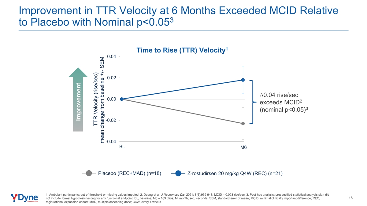 TTR速度在6个月时的改善超过MCID相对3与名义p < 0.05 1上升时间(TTR)速度0.04 0.02丨0.04上升/秒0.00 2超过MCID 3(名义p < 0.05)-0.02-0.04 BL M6安慰剂(REC + MAD)(n = 18)Z-rostudirsen 20 mg/kg Q4W(REC)(n = 21)1。救护车参与者;超阈值或缺失值估算。2.Duong et al. J Neuromusc DIS。2021;8(6):939-948;MCID = 0.02 3升/秒3。事后分析;预先指定的统计分析计划18不包括任何功能终点的正式假设测试。BL,基线;M6 = 169天;M,月;sec,秒;SEM,均值标准误差;MCID,最小临床重要差异;REC,注册扩展队列;MAD,多次递增剂量;Q4W,每4周一次。改善TTR速度(升/秒)较基线平均变化+/-SEM
