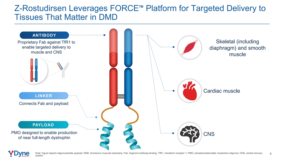 Z-Rostudirsen利用FORCE平台向DMD抗体骨组织(包括针对TFR1的专有FAB,以实现对横膈膜的靶向递送)和平滑肌和CNS肌肉的组织进行靶向递送。心肌链接器连接FAB和有效载荷PAYLOAD PMO,旨在使近全长抗肌萎缩蛋白的生产CNS注:图中描绘了寡核苷酸有效载荷;DMD,杜氏肌营养不良症;FAB,片段抗体结合;TFR1,转铁蛋白受体1;PMO,磷酰胺吗啉基寡聚体;CNS,中枢神经系统8。