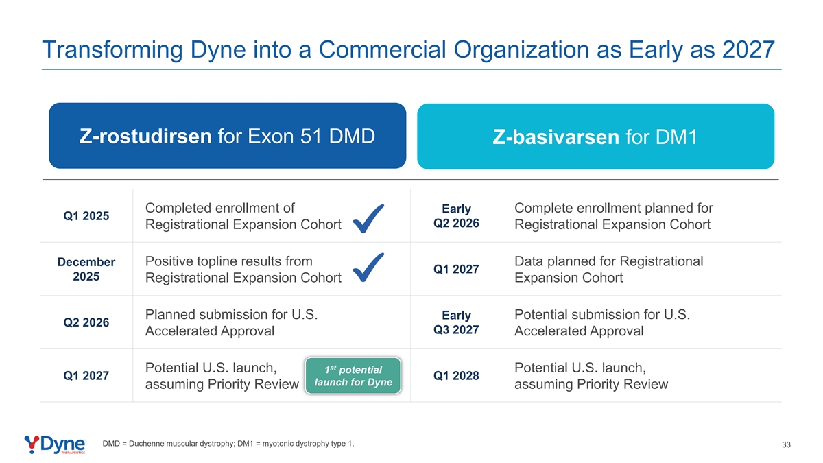最早在2027年将达因转变为商业组织用于外显子51的Z-rostudirsen DMD用于DM1的Z-basivarsen完成了计划于2025年第一季度进行的早期完整注册的注册2026年第二季度注册扩展队列注册扩展队列积极的顶线结果来自计划于注册的数据2027年第一季度2025年注册扩展队列扩展队列计划提交的美国潜在提交的美国早期Q2 2026年第三季度2027年第三季度加速批准加速批准ST潜在的美国启动,潜在的美国启动,假设优先审查假设优先审查DMD = Duchenne肌营养不良症;DM1 =强直性肌营养不良症1型,为达因推出1个潜在的2027年Q1 2028年Q1。33