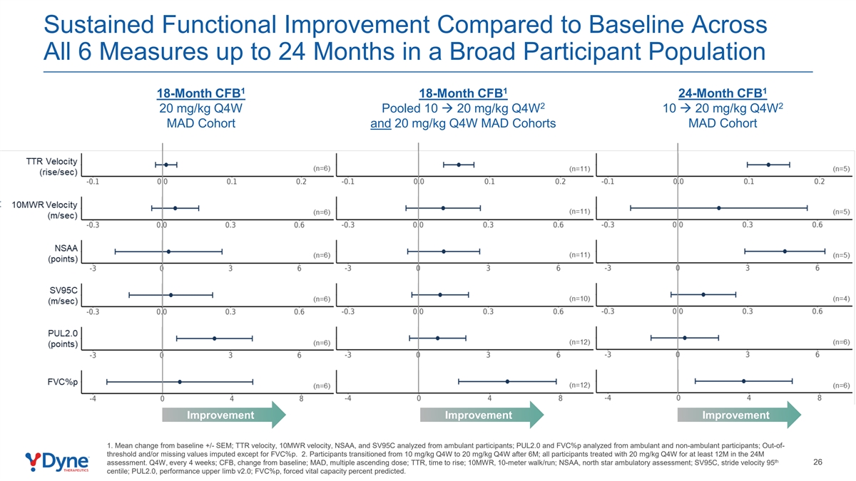 广泛参与人群中所有6项措施与基线相比的持续功能改善长达24个月1111 18个月CFB 18个月CFB 24个月CFB 2220mg/kg Q4W汇总10 à 20mg/kg Q4W MAD队列和20mg/kg Q4W MAD队列MAD队列改善改善改善1。与基线+/-SEM的均值变化;从流动参与者中分析TTR速度、10MWR速度、NSAA和SV95C;从流动和非流动参与者中分析PUL2.0和丨% p;除FVC之外的超阈值和/或漏测值p.2。参与者在6M后从10 mg/kg Q4W过渡到20 mg/kg Q4W;所有参与者在第24m评估中接受至少12M的20 mg/kg Q4W治疗。Q4W,每4周一次;CFB,较基线变化;MAD,多次递增剂量;TTR,上升时间;10MWR,10米步行/跑步;NSAA,北极星动态评估;SV95C,步速9526个百分位;PUL2.0,性能上肢v2.0;FVC p,强制肺活量百分比预测。