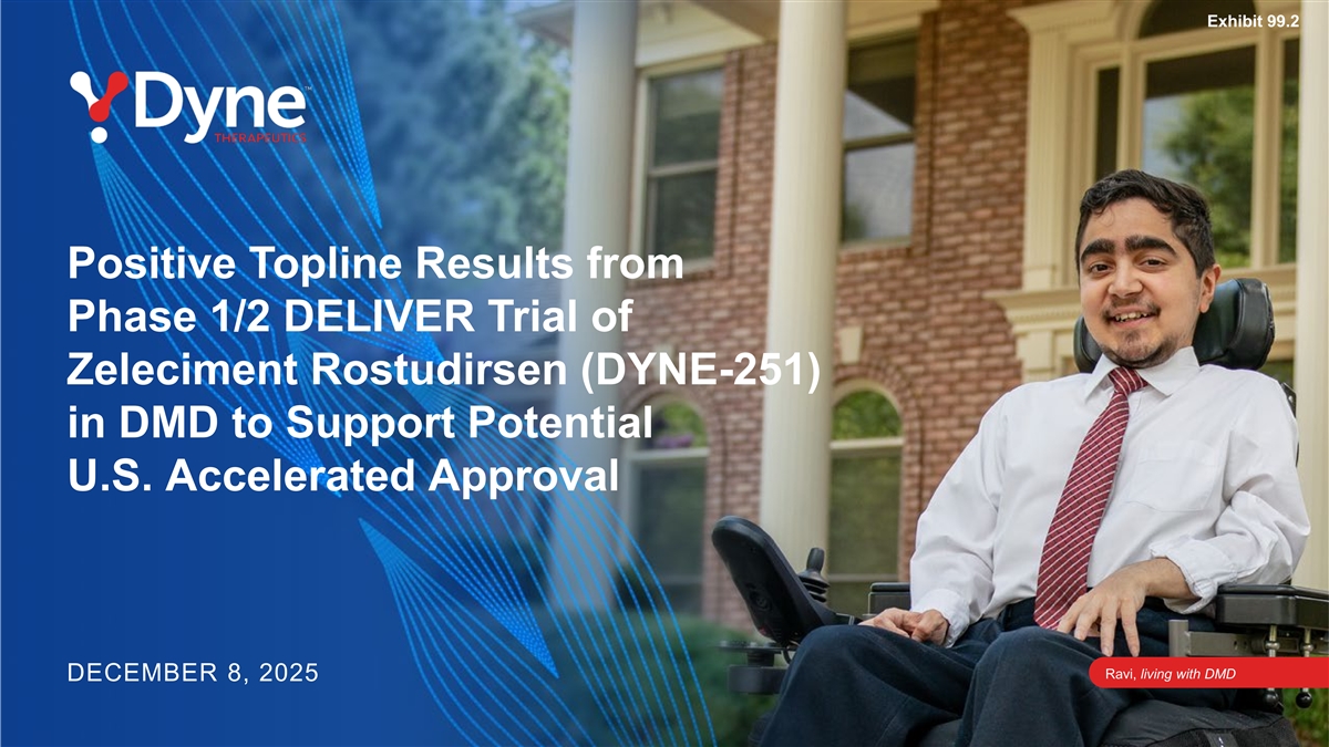 Zeleciment Rostudirsen(DYNE-251)在DMD中的1/2期交付试验的99.2阳性顶线结果,以支持潜在的美国加速批准Ravi,与DMD一起生活2025年12月8日