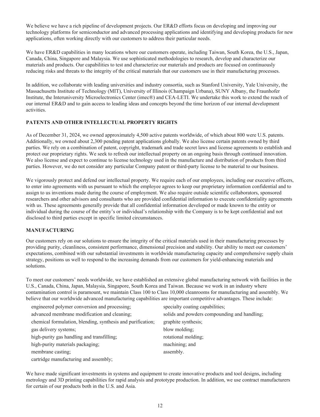 我们相信我们拥有丰富的开发项目管道。我们的ER & D工作专注于开发和改进我们用于半导体和先进加工应用的技术平台,以及识别和开发用于新应用的产品,通常直接与我们的客户合作,以满足他们的特殊需求。我们在客户经营的许多地区都有ER & D能力,包括台湾、韩国、美国、日本、加拿大、中国、新加坡和马来西亚。我们使用复杂的方法来研究、开发和表征我们的材料和产品。我们测试和表征我们的材料和产品的能力的重点是不断降低对客户在其制造过程中使用的关键材料完整性的风险和威胁。此外,我们还与领先的大学和行业联盟合作,如斯坦福大学、耶鲁大学、麻省理工学院(MIT)、伊利诺伊大学(香槟校厄巴纳)、SUNY奥尔巴尼、弗劳恩霍夫研究所、校际微电子中心(IMEC®)和CEA-LETI。我们开展这项工作是为了扩大我们内部ER & D的覆盖范围,并在我们内部开发活动的时间范围之外获得领先的想法和概念。专利和其他知识产权截至2024年12月31日,我们在全球拥有约4500项有效专利,其中约800项为美国专利。此外,我们在全球拥有约2,300项待决专利申请。我们还许可第三方拥有的某些专利。我们依靠专利、版权、商标和商业秘密法律和许可协议的组合来建立和保护我们的专有权利。我们寻求通过持续创新,不断刷新我们的知识产权。我们还许可并预计将继续许可用于第三方产品制造和分销的技术。然而,我们并不认为任何特定的公司专利或第三方许可对我们的业务具有重要意义。我们大力保护和捍卫我们的知识产权。我们要求我们的每位员工,包括我们的执行官,与我们签订协议,根据这些协议,员工同意对我们的专有信息保密,并将在受雇过程中做出的发明转让给我们。我们还要求外部科学合作者、受资助的研究人员以及获得机密信息的其他顾问和顾问与我们执行保密协议。这些协议一般规定,在实体或个人与公司的关系过程中开发或告知实体或个人的所有机密信息应予保密,除非在特定的有限情况下,不得向第三方披露。制造我们的客户依赖我们的解决方案,通过提供纯度、清洁度、一致的性能、尺寸精度和稳定性来确保其制造过程中使用的关键材料的完整性。我们满足客户期望的能力,加上我们对全球制造能力和全面供应链战略的大量投资,使我们能够很好地应对客户对提高产量的材料和解决方案日益增长的需求。为满足全球客户的需求,我们建立了广泛的全球制造网络,在美国、加拿大、中国、日本、马来西亚、新加坡、韩国和台湾设有工厂。因为我们在一个污染控制至高无上的行业工作,我们维持100级到10,000级的洁净室用于制造和组装。我们相信,我们在世界范围内的先进制造能力是重要的竞争优势。其中包括:工程聚合物转化和加工;特种涂层能力;先进的膜改性和清洗;固体和粉末复合和处理;化学配方、共混、合成和纯化;石墨合成;气体输送系统;吹塑;高纯气体处理和转灌;旋转成型;高纯材料包装;机械加工;和膜铸造;组装。墨盒制造和组装;我们在系统和设备方面进行了重大投资,以创造创新产品和工具设计,包括用于快速分析和原型制作的计量和3D打印能力。此外,我们在美国和亚洲的某些产品都使用合同制造商。12