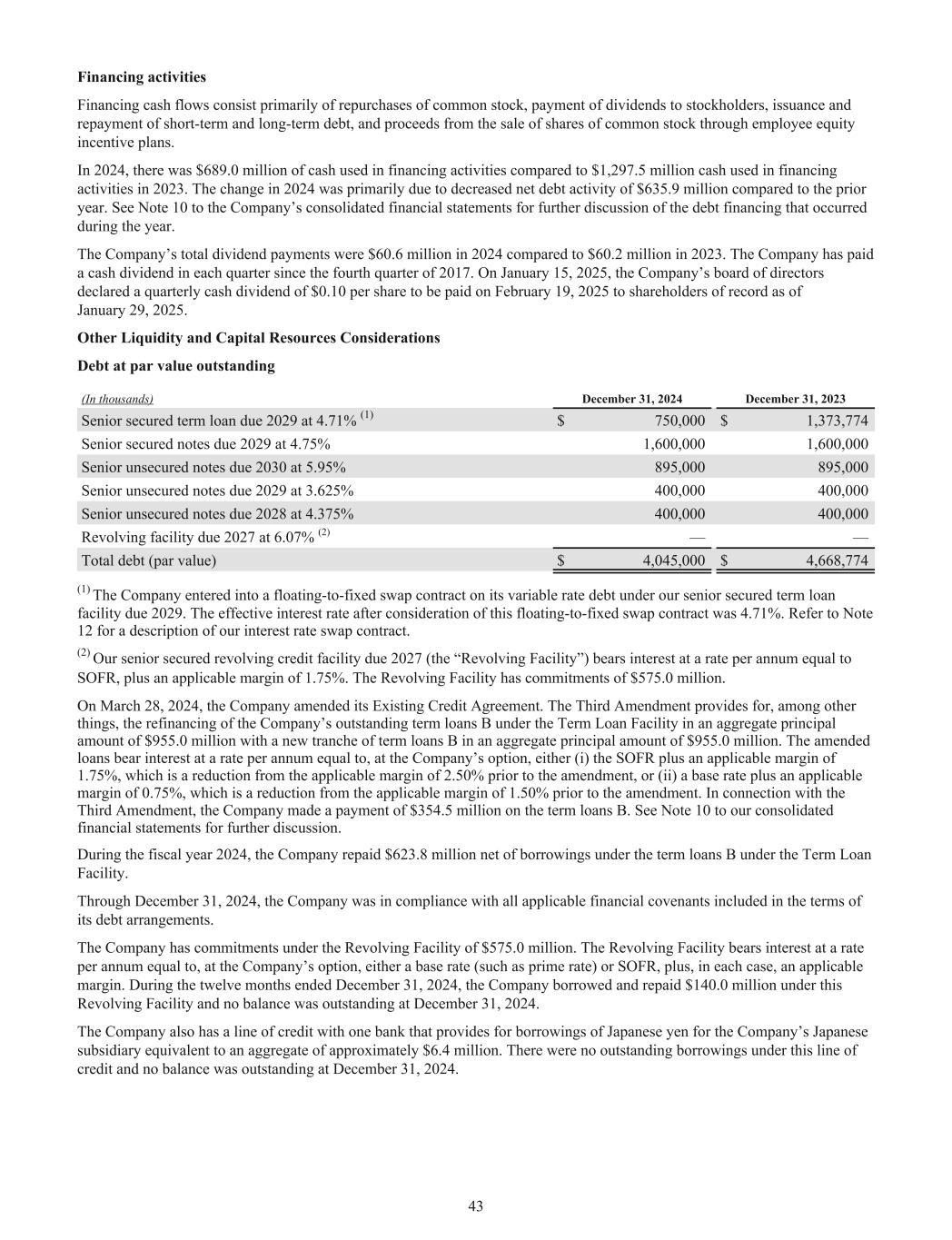 筹资活动筹资现金流主要包括回购普通股、向股东支付股息、发行和偿还短期和长期债务,以及通过员工股权激励计划出售普通股股票的收益。2024年,用于筹资活动的现金为6.89亿美元,而2023年用于筹资活动的现金为12.975亿美元。2024年的变化主要是由于与上一年相比净债务活动减少了6.359亿美元。有关年内发生的债务融资的进一步讨论,请参阅公司综合财务报表附注10。该公司2024年的股息支付总额为6060万美元,而2023年为6020万美元。公司自2017年第四季度起,每季度均派发现金股利。2025年1月15日,公司董事会宣布将于2025年2月19日向截至2025年1月29日在册的股东支付每股0.10美元的季度现金股息。其他流动性和资本资源对价未偿面值债务(单位:千)2024年12月31日12月31日,2023年2029年到期高级有担保定期贷款利率4.71%(1)750,000美元1,373,774美元2029年到期高级有担保票据利率4.75% 1,600,000美元1,600,000美元2030年到期高级无担保票据利率5.95% 895,000美元895,000美元2029年到期高级无担保票据利率3.625% 400,000美元400,000美元2027年到期高级无担保票据利率6.07%(2)——总债务(面值)4,045,000美元4,668,774美元(1)公司就2029年到期高级有担保定期贷款融资项下的浮动利率债务订立浮动到固定掉期合同。考虑这一浮动转固定掉期合约后的实际利率为4.71%。有关我们的利率互换合约的描述,请参见附注12。(2)我们2027年到期的高级有担保循环信贷融资(“循环融资”)的年利率等于SOFR,外加1.75%的适用保证金。循环贷款承付款为5.75亿美元。2024年3月28日,公司修订了现有的信贷协议。第三修正案规定(其中包括)根据定期贷款融资为公司未偿还的定期贷款B再融资,本金总额为9.550亿美元,新一批定期贷款B的本金总额为9.550亿美元。经修订贷款的年利率相当于(公司可选择)(i)SOFR加上1.75%的适用保证金,即较修订前的适用保证金2.50%有所减少,或(ii)基本利率加上0.75%的适用保证金,即较修订前的适用保证金1.50%有所减少。就第三次修订而言,公司就定期贷款B支付了3.545亿美元。有关进一步讨论,请参阅我们的合并财务报表附注10。在2024财年,公司偿还了定期贷款融资下的定期贷款B项下的借款净额6.238亿美元。截至2024年12月31日,公司遵守了债务安排条款中包含的所有适用财务契约。该公司在循环贷款下的承付款为5.75亿美元。循环贷款的年利率等于公司可选择的基准利率(如最优惠利率)或SOFR,在每种情况下加上适用的保证金。在截至2024年12月31日的十二个月内,公司在此循环贷款下借入和偿还了1.40亿美元,截至2024年12月31日没有未偿余额。公司还与一家银行有一笔信贷额度,为公司的日本子公司提供相当于总额约640万美元的日元借款。该信贷额度下没有未偿还借款,截至2024年12月31日也没有未偿还余额。43