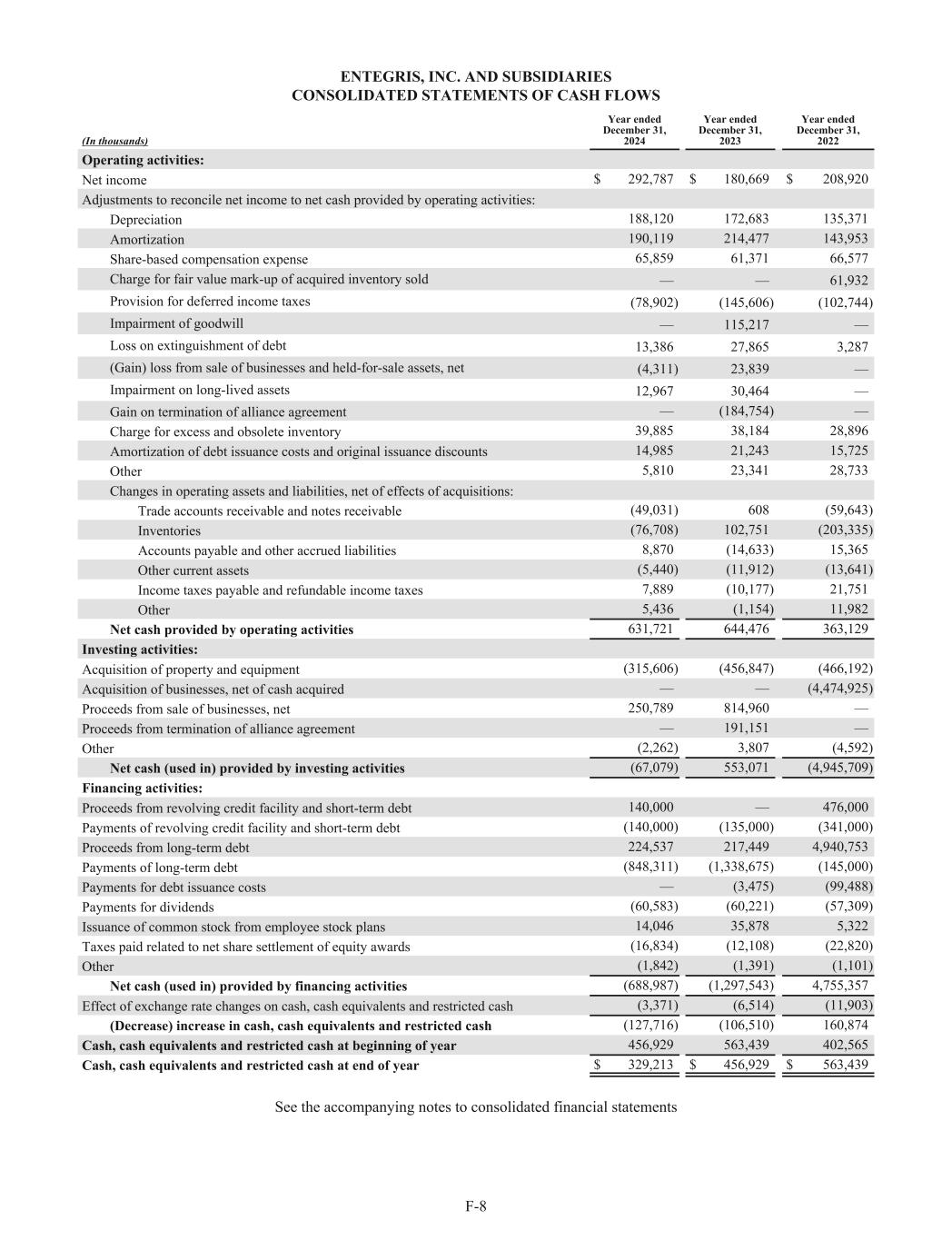 E N T E G R is,I N C. A N D S U B SI D IA R IE S C O N so L ID A T E D S T A T E M E N T S O F E Q U IT Y(i n th ou sa nd s)c om m on sh ar es is su ed t re as ur y sh ar es c om m on sh ar es ou ts ta nd in g c om m on st oc k t reAs ur y st oc k a dd iti on al pa id in ca pi ta l r et ai ne d ea rn in gs fo re ig n cu rr en cy tr an sl at io n ad ju st m en ts d ef in ed be ne fit pe ns io n ad ju st m en ts in te re st r at e sw ap-ca sh flo w h ed ge t ot al b al an ce a t d ec em be r 31,2 02 1 13 5, 71 9 (2 02 ) 13 5, 51 7 1, 35 7 (7 ,1 12 ) 87 9, 84 5 87 9, 77 6 (3 8, 86 3) (1 ,2 22 ) — 1, 71 3,781 SH ar es is su ed u nd er st oc k pl an s 692 — 6927 —(6,659)————(6,652)SH ar e-ba se d co m pe ns at io n ex pe ns e ———————— 66,578 ———— 66,578 is su an ce o f c om m on st oc k in c on ne ct io n w ith C m c m at er ia ls a cqui si tio n 12,928 — 12,928129 — 1,265,561 ———— 1,265,690 d iv id en ds d ec la re d(0美元。40 p er sh ar e)————————(57,305)————(57,305)in te re st ra te sw ap-ca sh fl ow h ed ge —————————— 36,06936,069 pe ns io n ad ju st m en t —————————— 1,139 — 1,139 Fo re ig n cu rr en cy tr an sl at io n ————————(10,220)——(10,220)N et in co m e —————— 208,920 ———— 208,920 b al an ce a t d ec em be r 31,2022149,339(202)149,1371,493(7,112)2,205,3251,031,391(49,083)(83)36,0693,218,000 SH ar es is su ed u nd er st oc k pl an s 1,227 — 1,22713 — 38,671 ———— 38,684 SH ar e-ba se d co m pe ns at io n ex pe ns e —————— 61,371 ———— 61,371 d iv id en ds d ec la re d(0美元。40 p er sh ar e)————————(60,295)————(60,295)in te re st ra te sw ap-ca sh fl ow h ed ge ——————————(17,435)(17,435)PE ns io n ad ju st m en t ———————— 397 — 397 Fo re ig n cu rr en cy tr an sl at io n ————————(12,797)——(12,797)N et in co m e —————— 180,669 ———— 180,669 b al an ce a t d ec em be r 31,2023150,56 6 (2 02 ) 15 0, 36 4 1, 50 6 (7 ,1 12 ) 2, 30 5, 36 7 1, 15 1, 76 5 (6 1, 88 0) 31 4 18 ,6 34 3, 40 8,594 SH ar es is su ed u nd er st oc k pl an s 758 — 7587 — 14,117 ———— 14,1 24 SH ar e-ba se d co m pe ns at io n ex pe ns e —————— 65,859 ———— 65,859 d iv id en ds d ec la re d(0美元。40 p er sh ar e)————————(60,675)————(60,675)in te re st ra te sw ap-ca sh fl ow h ed ge ————————————(13,111)(13,111)PE ns io n ad ju st m en t ——————————(324)—(324)Fo re ig n c u rr en cy tr an sl at io n ————————(15,750)————(15,750)N et in co m e —————— 292,787 ———— 292,787 b al an ce a t d ec em be r 31,2024151,324(202)151,122 $ 1,513 $(7,112)$ 2,385,343 $ 1,383,877 $(77,630)$(10)$ 5,523 $ 3,691,504 se e th e ac co m pa ny in g no te s t o co ol id at ed fi na nc ia l s ta te m en ts。F-7