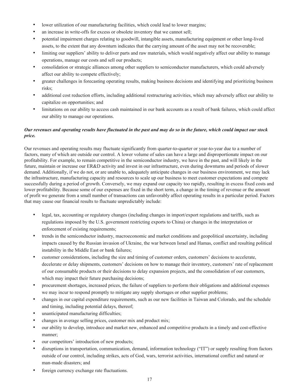 •我们的制造设施利用率降低,这可能导致利润率下降;•我们无法出售的过剩或过时库存的核销增加;•与商誉、无形资产、制造设备或其他长期资产相关的潜在减值费用,只要任何低迷表明资产的账面金额可能无法收回;•限制我们的供应商交付零部件和原材料的能力,这将对我们管理运营、管理成本和销售产品的能力产生负面影响;•半导体制造商的其他供应商之间的合并或战略联盟,这可能会对我们有效竞争的能力产生不利影响;•在预测经营业绩、做出业务决策以及识别和优先考虑业务风险方面面临更大挑战;•额外的成本削减努力,包括额外的重组活动,这可能会对我们利用机会的能力产生不利影响;•由于银行倒闭,我们获得银行账户中保持的现金的能力受到限制,这可能会影响我们管理业务的能力。我们的收入和经营业绩过去有波动,未来也可能有波动,这可能会影响我们的股价。由于许多因素,我们的收入和经营业绩可能会在季度间或年度间出现显着波动,其中许多因素超出了我们的控制范围。较低的销售量可能会对我们的盈利能力产生巨大且不成比例的影响。例如,为了在半导体行业保持竞争力,我们过去有,未来也可能会,维持或增加我们的ER & D活动并投资于我们的基础设施,即使在经济低迷和需求放缓时期也是如此。此外,如果我们没有或无法充分预测我们的商业环境的变化,我们可能缺乏基础设施、制造能力和资源来扩大我们的业务以满足客户的期望并在增长期成功竞争。反之,我们可能会过快扩张产能,导致固定成本过剩,盈利能力下降。因为我们的一些费用在短期内是固定的,收入的时间或我们从少量交易中产生的利润金额的变化可能会对特定时期的经营业绩产生不利影响。可能导致我们的财务业绩出现不可预测波动的因素包括:•法律、税务、会计或监管变化(包括进出口法规和关税的变化,例如美国政府实施的限制对华出口的法规)或现有要求的解释或执行变化;•半导体行业趋势、宏观经济和市场状况以及地缘政治不确定性,包括俄罗斯入侵乌克兰、以色列和哈马斯之间的战争、冲突以及由此导致的中东政治不稳定或银行倒闭造成的影响;•客户考虑因素,包括客户订单的规模和时间安排,客户决定加速、减速或延迟发货,客户决定如何管理其库存,客户更换我们的消耗性产品的速度或他们决定推迟扩张项目,以及我们的客户的整合,这可能会影响他们未来的采购决策;•采购短缺、价格上涨、供应商未能履行其义务以及我们可能产生的额外费用,以迅速响应以缓解任何供应短缺或其他供应商问题;•我们的资本支出要求发生变化,例如我们在台湾和科罗拉多州的新设施,以及时间表和时间安排,包括潜在的延迟,其中;•未预料到的制造困难;•平均售价、客户组合和产品组合的变化;•我们有能力及时和具有成本效益地开发、引进和营销新的、增强的和有竞争力的产品;•我们的竞争对手推出新产品;•我们无法控制的因素导致交通、通信、需求、信息技术(“IT”)或供应中断,包括罢工、天灾、战争、恐怖活动、国际冲突和自然或人为灾难;以及17 •外汇汇率波动。