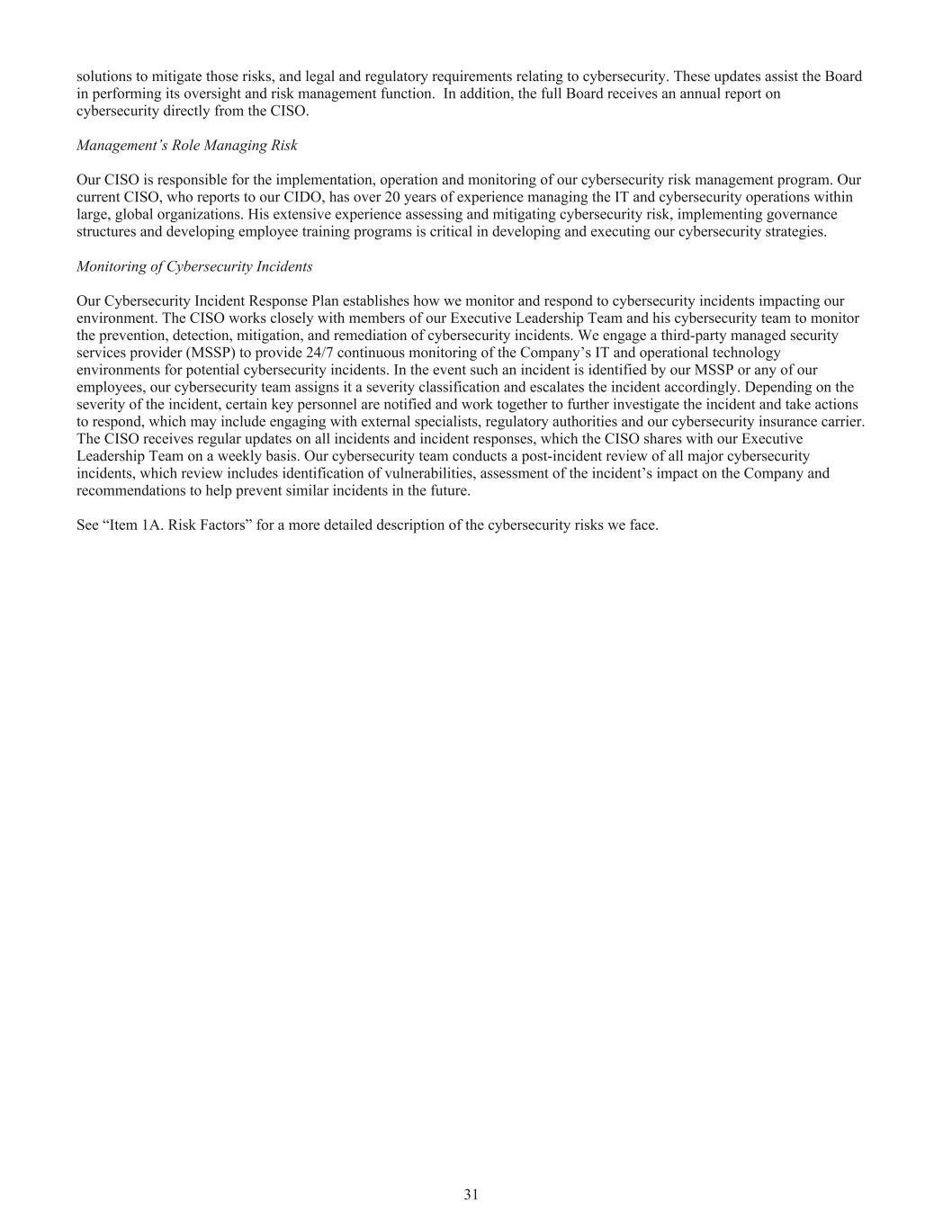 缓解这些风险的解决方案,以及与网络安全相关的法律和监管要求。这些更新有助于审计委员会履行监督和风险管理职能。此外,全体董事会还直接从CISO收到有关网络安全的年度报告。管理层的作用管理风险我的CISO负责我们的网络安全风险管理计划的实施、运营和监控。我们现任的CISO向我们的CIDO报告,他在管理大型全球组织内的IT和网络安全运营方面拥有超过20年的经验。他在评估和缓解网络安全风险、实施治理结构和制定员工培训计划方面的丰富经验对于制定和执行我们的网络安全战略至关重要。监测网络安全事件我们的网络安全事件响应计划确定了我们如何监测和应对影响我们环境的网络安全事件。CISO与我们的执行领导团队成员及其网络安全团队密切合作,以监测网络安全事件的预防、检测、缓解和补救。我们聘请第三方托管安全服务提供商(MSSP)对公司的IT和运营技术环境进行全天候持续监控,以应对潜在的网络安全事件。如果此类事件被我们的MSSP或我们的任何员工发现,我们的网络安全团队会为其分配一个严重程度分类,并相应地升级该事件。根据事件的严重程度,会通知某些关键人员,并共同努力进一步调查事件并采取行动应对,其中可能包括与外部专家、监管机构和我们的网络安全保险承保人进行接触。CISO定期接收所有事件和事件响应的最新信息,CISO每周与我们的执行领导团队分享这些信息。我们的网络安全团队对所有重大网络安全事件进行事后审查,审查包括识别漏洞、评估事件对公司的影响以及帮助防止未来发生类似事件的建议。见“项目1a。风险因素”,以更详细地描述我们面临的网络安全风险。31