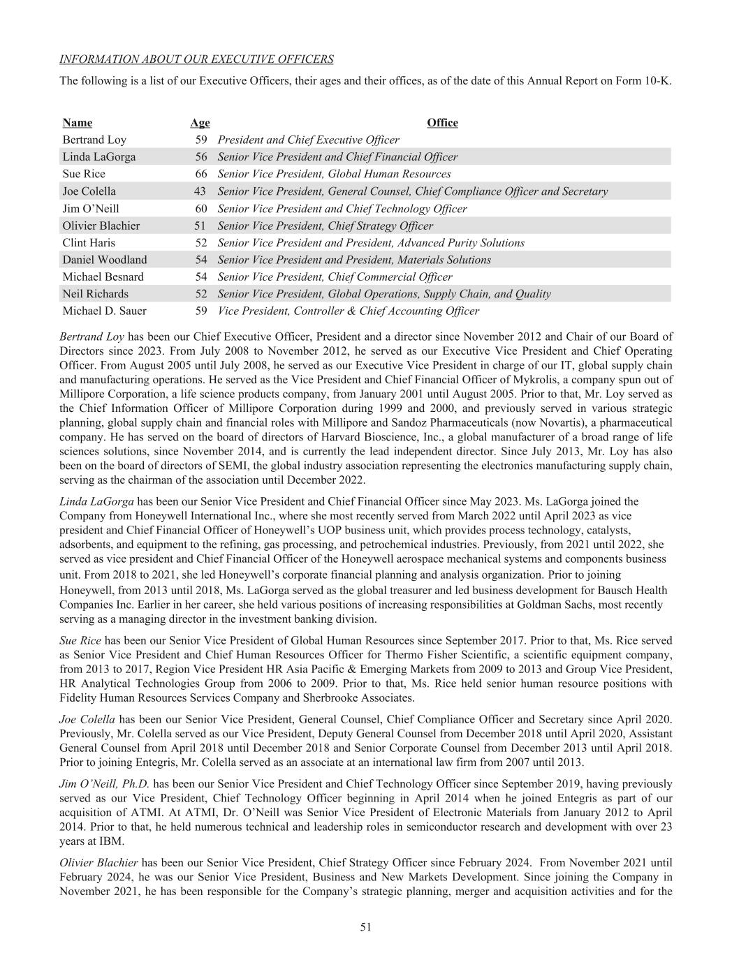 有关我们执行官的信息以下是截至本年度报告表格10-K之日的执行官名单、他们的年龄和办公室。姓名年龄办公室Bertrand Loy 59总裁兼首席执行官Linda LaGorga 56高级副总裁兼首席财务官Sue Rice 66高级副总裁兼全球人力资源高级副总裁Joe Colella 43高级副总裁、总法律顾问、首席合规官兼秘书Jim O'Neill 60高级副总裁兼首席技术官TERM0Olivier Blachier 51高级副总裁,首席战略官Clint Haris 52高级纯净解决方案高级副总裁兼总裁Daniel Woodland 54材料解决方案高级副总裁兼总裁Michael Besnard 54高级副总裁兼首席商务官Neil Richards 52负责全球运营、供应链和质量的高级副总裁Michael D. Sauer 59副总裁、财务总监兼首席财务官Bertrand Loy自2012年11月起担任我们的首席执行官、总裁兼董事,并自2023年起担任我们的董事会主席。2008年7月至2012年11月,他担任我们的执行副总裁兼首席运营官。从2005年8月到2008年7月,他担任我们的执行副总裁,负责我们的IT、全球供应链和制造业务。他曾于2001年1月至2005年8月在Mykrolis担任副总裁兼首席财务官,Mykrolis是一家生命科学产品公司Millipore Corporation分拆出来的公司。在此之前,Loy先生于1999年和2000年期间担任Millipore Corporation的首席信息官,此前曾在Millipore和制药公司Sandoz Pharmaceuticals(现为诺华)担任多个战略规划、全球供应链和财务职务。他自2014年11月起担任全球范围广泛的生命科学解决方案制造商Harvard Bioscience, Inc.的董事会成员,现任首席独立董事。自2013年7月以来,Loy先生还担任SEMI的董事会成员,SEMI是代表电子制造供应链的全球行业协会,担任该协会的主席至2022年12月。Linda LaGorga自2023年5月起担任我们的高级副总裁兼首席财务官。LaGorga女士从霍尼韦尔国际公司加入公司,最近一次任职于2022年3月至2023年4月,担任霍尼韦尔的UOP业务部门的副总裁兼首席财务官,该部门为炼油、气体处理和石油化工行业提供工艺技术、催化剂、吸附剂和设备。此前,2021年至2022年,她担任霍尼韦尔航空航天机械系统和部件事业部副总裁兼首席财务官。2018年至2021年,她领导了霍尼韦尔的企业财务规划和分析组织。在加入霍尼韦尔之前,从2013年到2018年,LaGorga女士担任全球财务主管,并在Bausch Health Companies Inc.健康公司领导业务发展。在她职业生涯的早期,她曾在高盛 Sachs担任过各种职责日益增加的职位,最近担任投资银行部门的董事总经理。Sue Rice自2017年9月起担任我们的全球人力资源高级副总裁。在此之前,赖斯女士曾于2013年至2017年担任科学设备公司赛默飞世尔的高级副总裁兼首席人力资源官,2009年至2013年担任HR亚太和新兴市场区域副总裁,2006年至2009年担任HR分析技术集团集团副总裁。在此之前,赖斯女士曾在富达人力资源服务公司和Sherbrooke Associates担任高级人力资源职务。Joe Colella自2020年4月起担任我们的高级副总裁、总法律顾问、首席合规官和秘书。此前,Colella先生曾担任我们的副总裁、2018年12月至2020年4月的副总法律顾问、2018年4月至2018年12月的助理总法律顾问以及2013年12月至2018年4月的高级公司法律顾问。在加入英特格之前,Colella先生于2007年至2013年期间担任一家国际律师事务所的合伙人。Jim O'Neill博士自2019年9月起担任我们的高级副总裁兼首席技术官,此前曾于2014年4月开始担任我们的副总裁兼首席技术官,当时他在我们收购ATMI的过程中加入了英特格。在ATMI,奥尼尔博士于2012年1月至2014年4月担任电子材料高级副总裁。在此之前,他在半导体研发领域担任过多个技术和领导职务,在IBM工作了超过23年。Olivier Blachier自2024年2月起担任我们的高级副总裁、首席战略官。从2021年11月到2024年2月, 他是我们的业务和新市场开发高级副总裁。自2021年11月加入公司以来,一直负责公司战略规划、并购活动和51