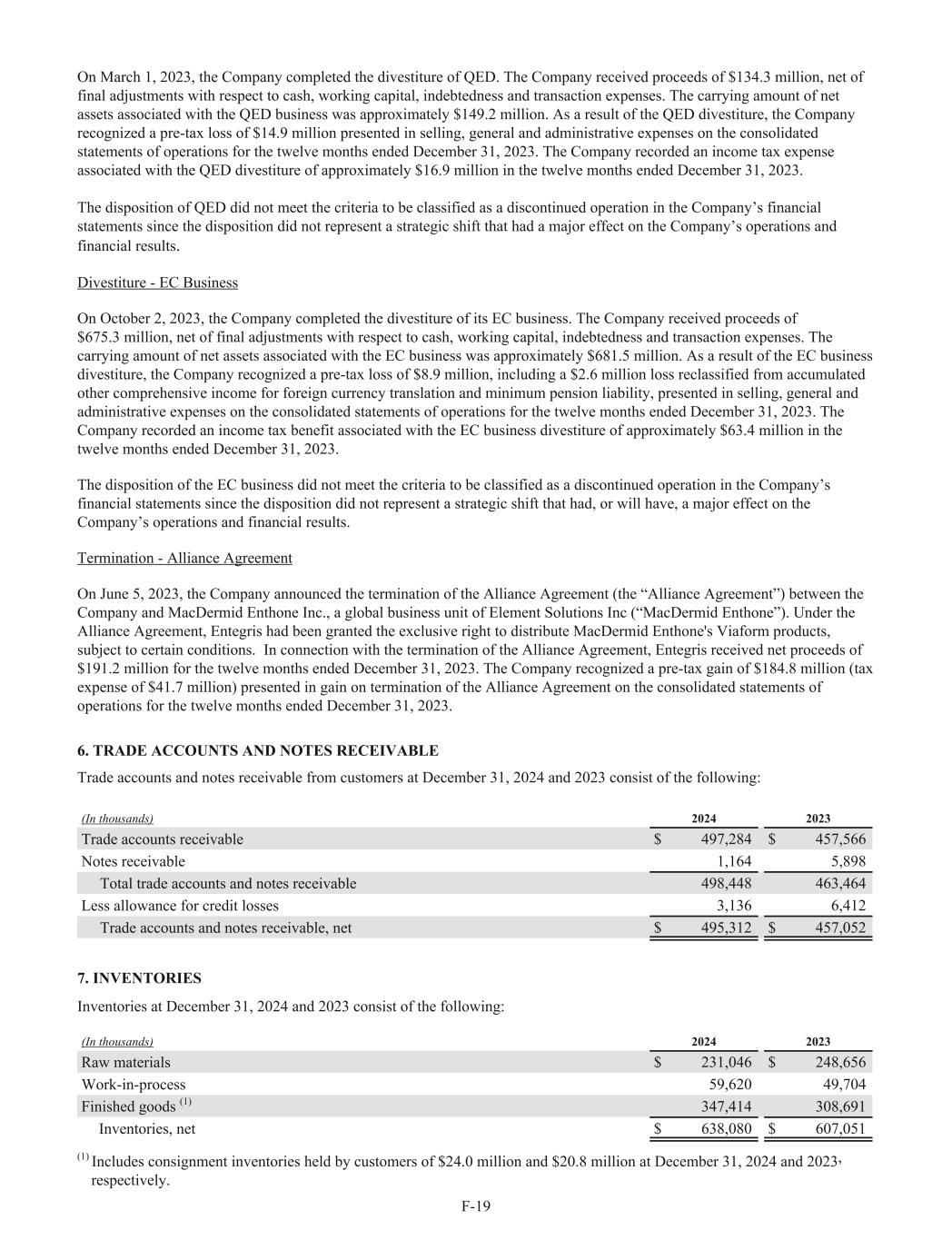 2023年3月1日,公司完成了对QED的剥离。该公司收到的收益为1.343亿美元,扣除现金、营运资金、债务和交易费用的最终调整。与QED业务相关的净资产账面值约为1.492亿美元。由于剥离了QED,该公司在截至2023年12月31日的十二个月的综合经营报表中确认了列报于销售、一般和管理费用的税前亏损1490万美元。该公司在截至2023年12月31日的十二个月内记录了与QED资产剥离相关的所得税费用约1690万美元。QED的处置未达到在公司财务报表中归类为终止经营的标准,因为该处置并不代表对公司经营和财务业绩产生重大影响的战略转变。剥离-EC业务2023年10月2日,公司完成了EC业务的剥离。该公司收到的收益为6.753亿美元,扣除现金、营运资金、债务和交易费用的最终调整。与EC业务相关的净资产账面值约为6.815亿美元。由于剥离EC业务,公司确认了890万美元的税前亏损,其中包括从累计其他综合收入中重新分类的外币换算和最低养老金负债的260万美元亏损,在截至2023年12月31日的十二个月的综合经营报表中以销售、一般和管理费用列报。该公司在截至2023年12月31日的十二个月中录得与EC业务剥离相关的所得税优惠约6340万美元。EC业务的处置未达到在公司财务报表中归类为终止经营的标准,因为该处置并不代表对公司运营和财务业绩产生或将产生重大影响的战略转变。终止-联盟协议于2023年6月5日,公司宣布终止公司与Element Solutions Inc(“MacDermid Enthone”)的全球业务部门MacDermid Enthone Inc.之间的联盟协议(“联盟协议”)。根据联盟协议,英特格已被授予MacDermid Enthone的ViaForm产品的独家经销权,但须符合某些条件。就终止联盟协议而言,截至2023年12月31日止十二个月,英特格的所得款项净额为1.912亿美元。公司在截至2023年12月31日止十二个月的综合经营报表中确认了1.848亿美元的税前收益(税收费用为4170万美元),列于终止联盟协议的收益中。6.应收贸易账款和票据2024年12月31日和2023年12月31日应收客户贸易账款和应收票据如下:(单位:千)20242023应收贸易账款497,284美元457,566应收票据1,1645,898贸易账款和应收票据总额498,448463,464减信用损失备抵3,1366,412贸易账款和应收票据,净额495,312美元457,0527。Inventories 2024年12月31日和2023年12月31日的库存包括以下内容:(单位:千)20242023原材料231,046美元248,656美元在制品59,62049,704成品(1)347,414308,691库存,净额638,080美元607,051美元F-19(1)包括客户在2024年12月31日和2023年12月31日分别持有的2,400万美元和2,080万美元的寄售库存。