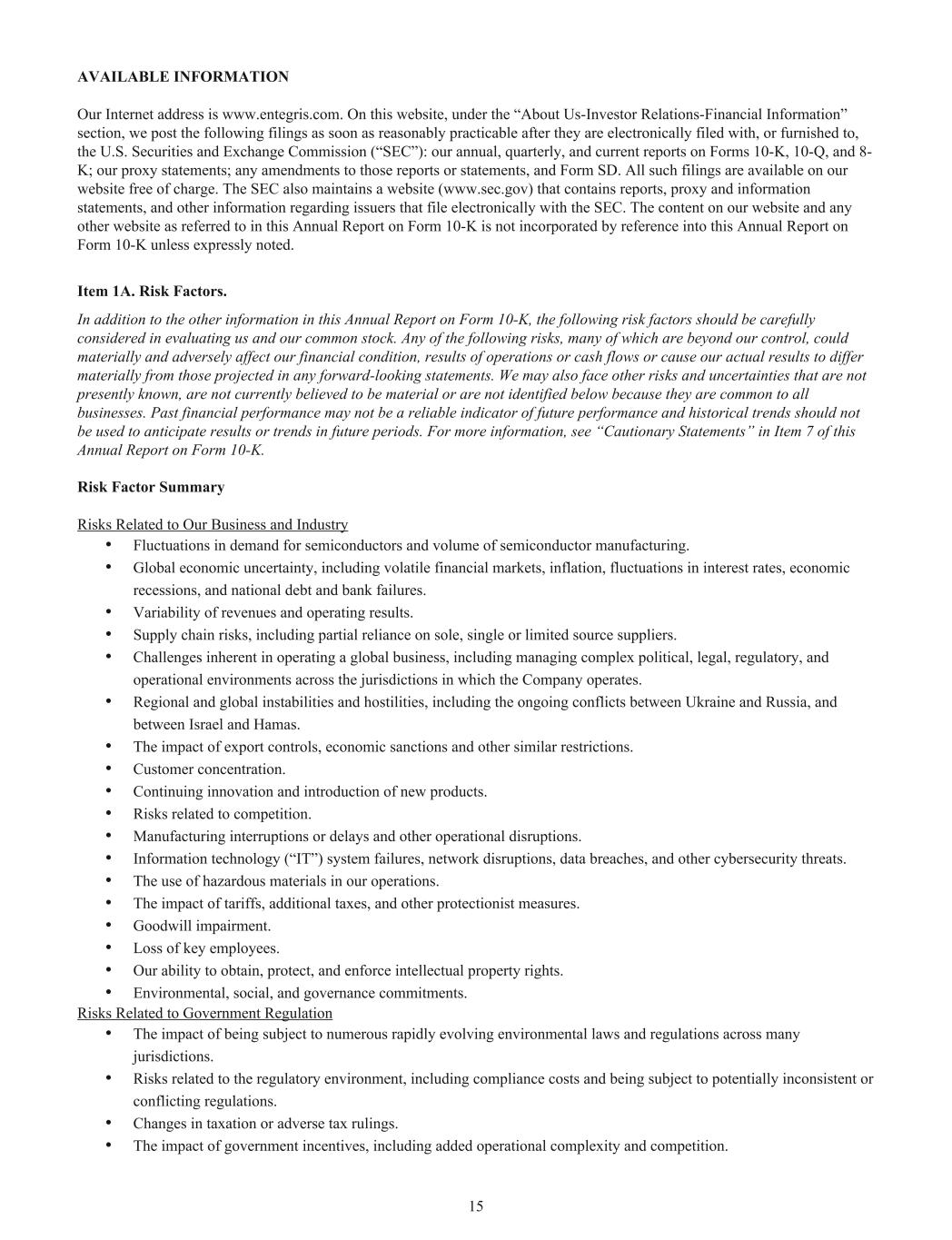 可用信息我们的互联网地址是www.entegris.com。在该网站上,在“关于美国-投资者关系-财务信息”部分下,我们在以电子方式向美国证券交易委员会(“SEC”)提交或提供给美国证券交易委员会(“SEC”)后,在合理可行的范围内尽快发布以下文件:我们关于表格10-K、10-Q和8-K的年度、季度和当前报告;我们的代理声明;对这些报告或声明的任何修改,以及表格SD。所有这类备案均可在我们的网站上免费查阅。SEC还维护一个网站(www.sec.gov),其中包含以电子方式向SEC提交的报告、代理和信息声明以及有关发行人的其他信息。除非明确说明,否则我们网站和本10-K表格年度报告中提及的任何其他网站上的内容不会通过引用方式并入本10-K表格年度报告。项目1a。风险因素。除了本年度报告中有关10-K表格的其他信息外,在评估我们和我们的普通股时,还应仔细考虑以下风险因素。以下任何风险,其中许多是我们无法控制的,都可能对我们的财务状况、经营业绩或现金流产生重大不利影响,或导致我们的实际结果与任何前瞻性陈述中预测的结果存在重大差异。我们还可能面临其他风险和不确定性,这些风险和不确定性目前未知、目前不被认为是重大的或未在下文中识别,因为它们对所有业务都是共同的。过去的财务业绩可能不是未来业绩的可靠指标,不应使用历史趋势来预测未来期间的结果或趋势。有关更多信息,请参阅本年度报告第10-K表第7项中的“警告声明”。风险因素摘要与我们的业务和行业相关的风险•半导体需求波动和半导体制造的数量。•全球经济不确定性,包括动荡的金融市场、通货膨胀、利率波动、经济衰退、国债和银行倒闭。•收入和经营业绩的可变性。•供应链风险,包括部分依赖唯一、单一或有限来源供应商。•经营全球业务所固有的挑战,包括管理公司经营所在辖区的复杂政治、法律、监管和运营环境。•地区和全球的不稳定和敌对行动,包括乌克兰和俄罗斯之间以及以色列和哈马斯之间的持续冲突。•出口管制、经济制裁和其他类似限制的影响。•客户集中。•持续创新,推出新产品。•与竞争相关的风险。•制造中断或延误以及其他运营中断。•信息技术(“IT”)系统故障、网络中断、数据泄露以及其他网络安全威胁。•在我们的运营中使用危险材料。•关税、附加税和其他保护主义措施的影响。•商誉减值。•关键员工流失。•我们获取、保护和执行知识产权的能力。•环境、社会和治理承诺。与政府监管相关的风险•受制于许多司法管辖区众多快速发展的环境法律法规的影响。•与监管环境相关的风险,包括合规成本和受到潜在不一致或相互冲突的监管的影响。•税收变化或不利的税收裁决。•政府激励措施的影响,包括增加运营复杂性和竞争。15