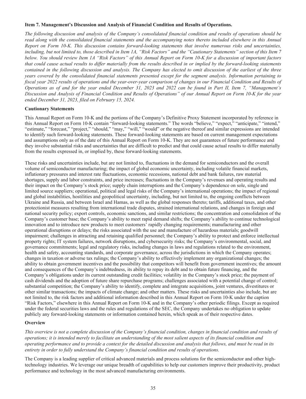 项目7。管理层对财务状况和经营成果的讨论与分析。以下关于公司综合财务状况和经营业绩的讨论和分析,应与本年度报告10-K表其他地方所载的综合财务报表及其随附的附注一起阅读。该讨论包含涉及众多风险和不确定性的前瞻性陈述,包括但不限于项目1a中描述的风险和不确定性,“风险因素”和下文项目7的“警示性陈述”部分。您应该在表格10-K上查看本年度报告的第1A项“风险因素”,以讨论可能导致实际结果与以下讨论和分析中包含的前瞻性陈述中描述或暗示的结果存在重大差异的重要因素。除分部分析外,公司已选择省略对所呈列的综合财务报表所涵盖的三个年度中最早的年度的讨论。有关2022财年经营业绩以及截至2023年12月31日和2022年12月31日止年度财务状况和经营业绩变化的同比比较的信息,可在我们于2024年2月15日提交的截至2023年12月31日止年度的10-K表格年度报告第二部分第7项“管理层对财务状况和经营业绩的讨论和分析”中找到。警示性声明这份关于10-K表格的年度报告和公司最终委托书的部分以引用方式并入这份关于10-K表格的年度报告,其中包含“前瞻性声明”。“相信”、“预期”、“预期”、“打算”、“估计”、“预测”、“项目”、“应该”、“可能”、“将”、“将”或其否定词和类似表述旨在识别此类前瞻性陈述。这些前瞻性陈述仅基于截至本年度报告10-K表格日期的当前管理层预期和假设。它们不是对未来业绩的保证,它们涉及难以预测的重大风险和不确定性,可能导致实际结果与这些前瞻性陈述中表达或暗示的结果存在重大差异。这些风险和不确定因素包括但不限于半导体需求和半导体制造业总体数量的波动;全球经济不确定性的影响,包括动荡的金融市场、通胀压力和利率波动、经济衰退、国债和银行倒闭、原材料短缺、供应和劳动力限制以及价格上涨;公司收入和经营业绩的波动及其对公司股价的影响;供应链中断以及公司对单一、单一和有限来源供应商的依赖;运营,公司国际业务的政治和法律风险;区域和全球不稳定、敌对行动和地缘政治不确定性的影响,包括但不限于乌克兰和俄罗斯之间以及以色列和哈马斯之间持续的冲突,以及全球对此的反应;国际贸易争端、紧张的国际关系以及外交和国家安全政策变化导致的关税、附加税和其他保护主义措施;出口管制、经济制裁,和类似的限制;公司客户群的集中和巩固;公司满足快速需求转移的能力;公司持续技术创新和推出新产品以满足客户快速变化的要求的能力;制造和其他运营中断或延误;与危险材料的使用和制造相关的风险;商誉减值;吸引和留住合格人员的挑战;公司保护和执行知识产权的能力;IT系统故障、网络中断和网络安全风险;公司的环境、社会和治理承诺;法律和监管风险,包括公司经营所在司法管辖区与环境、健康和安全、会计准则和公司治理相关的法律法规的变化;税收或不利税务裁决的变化;公司有效实施任何组织变革的能力;获得政府激励的能力以及竞争对手从政府激励中受益的可能性;公司债务的金额和后果、偿还债务和获得未来融资的能力, 以及公司在当前未偿还信贷额度下的义务;公司股价波动;支付现金股息和采用未来的股份回购计划;与潜在控制权变更相关的挑战;实质性竞争;公司识别、完成和整合收购、合资、资产剥离或其他类似交易的能力;气候变化的影响;以及其他事项。这些风险和不确定性还包括但不限于本10-K表格年度报告中在“风险因素”标题下描述的风险因素和附加信息,本10-K表格年度报告中的其他地方以及公司的其他定期文件中描述的风险因素和附加信息。除联邦证券法和SEC规则和条例要求外,公司不承担公开更新此处包含的任何前瞻性陈述或信息的义务,这些陈述或信息截至各自日期。概述本概述并非对公司财务状况、财务状况变化和经营业绩的完整讨论;其目的仅仅是为了便于了解其财务状况和经营业绩的最突出方面,并为随后的详细讨论和分析提供背景,必须全文阅读,以便全面了解公司的财务状况和经营业绩。公司是半导体及其他高技术行业关键先进材料和工艺解决方案的领先供应商。我们利用我们独特的能力广度,帮助我们的客户在最先进的制造环境中提高他们的生产力、产品性能和技术。35