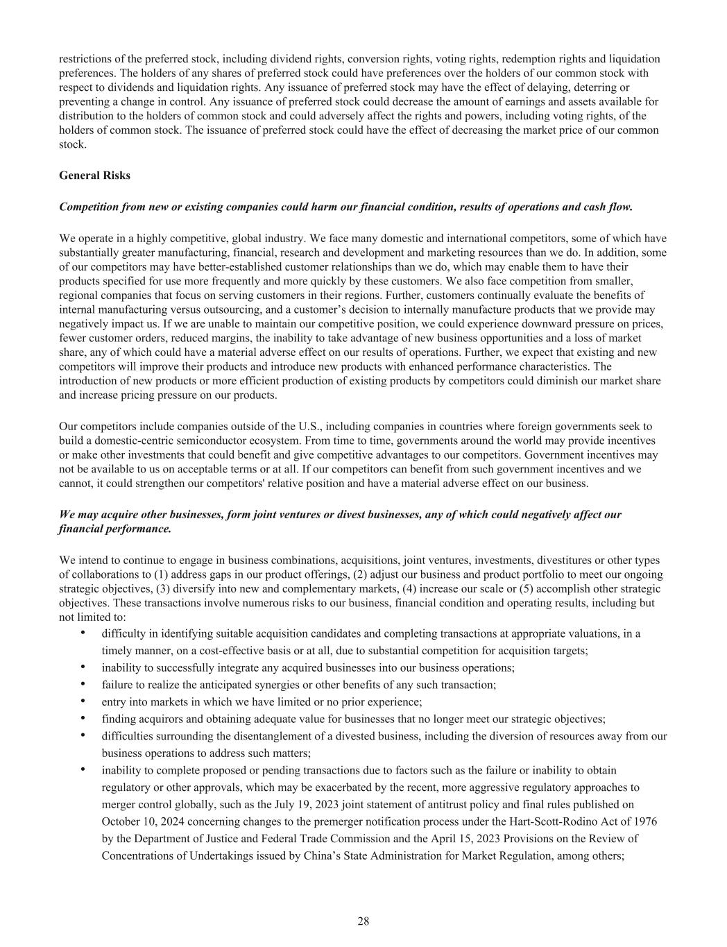 优先股的限制,包括股息权、转换权、投票权、赎回权和清算优先权。优先股任何股份的持有人在股息和清算权方面可以优先于我们普通股的持有人。任何优先股的发行都可能具有延迟、阻止或阻止控制权变更的效果。任何发行优先股都可能减少可分配给普通股持有人的收益和资产数量,并可能对普通股持有人的权利和权力(包括投票权)产生不利影响。发行优先股可能会降低我们普通股的市场价格。一般风险来自新公司或现有公司的竞争可能会损害我们的财务状况、经营业绩和现金流。我们在一个竞争激烈、全球化的行业中运营。我们面临许多国内和国际竞争对手,其中一些竞争对手拥有比我们大得多的制造、财务、研发和营销资源。此外,我们的一些竞争对手可能拥有比我们更好的客户关系,这可能使他们能够让他们的产品被这些客户更频繁、更快速地指定使用。我们还面临来自规模较小的区域性公司的竞争,这些公司专注于为所在地区的客户提供服务。此外,客户不断评估内部制造相对于外包的好处,客户决定内部制造我们提供的产品可能会对我们产生负面影响。如果我们无法保持我们的竞争地位,我们可能会遇到价格下行压力、客户订单减少、利润率下降、无法利用新的商机以及市场份额的损失,其中任何一项都可能对我们的经营业绩产生重大不利影响。此外,我们预计现有和新的竞争对手将改进其产品并推出具有增强性能特征的新产品。竞争对手推出新产品或更高效地生产现有产品可能会降低我们的市场份额,并增加我们产品的定价压力。我们的竞争对手包括美国以外的公司,包括外国政府寻求建立以国内为中心的半导体生态系统的国家的公司。世界各地的政府可能会不时提供激励措施或进行其他投资,以使我们的竞争对手受益并获得竞争优势。我们可能无法以可接受的条件或根本无法获得政府奖励。如果我们的竞争对手能够从这种政府激励措施中受益,而我们不能,这可能会加强我们竞争对手的相对地位,并对我们的业务产生重大不利影响。我们可能会收购其他业务、组建合资企业或剥离业务,其中任何一项都可能对我们的财务业绩产生负面影响。我们打算继续进行业务合并、收购、合资、投资、资产剥离或其他类型的合作,以(1)解决我们产品供应方面的差距,(2)调整我们的业务和产品组合以满足我们正在进行的战略目标,(3)多元化进入新的和互补的市场,(4)扩大我们的规模或(5)实现其他战略目标。这些交易涉及我们的业务、财务状况和经营业绩的众多风险,包括但不限于:•难以及时、在具有成本效益的基础上或根本无法确定合适的收购候选者并以适当估值完成交易,由于对收购目标的实质性竞争;•无法成功地将任何收购的业务整合到我们的业务运营中;•未能实现任何此类交易的预期协同效应或其他利益;•进入我们之前经验有限或没有经验的市场;•为不再符合我们战略目标的业务寻找收购方并获得足够的价值;•围绕剥离业务的解除纠缠存在困难,包括将资源从我们的业务运营中转移出去以处理此类事项;•由于未能或无法获得监管或其他批准等因素,无法完成拟议或待完成的交易,最近在全球范围内对合并控制采取更激进的监管方法可能会加剧这种情况,例如司法部和联邦贸易委员会于2024年10月10日发布的2023年7月19日反垄断政策和最终规则联合声明,内容涉及根据1976年《哈特-斯科特-罗迪诺法案》和4月15日对合并前通知程序进行的修改,中国市场监管总局发布的2023年度经营者集中审查规定, 除其他外;28