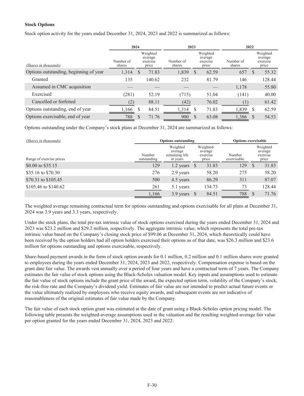 股票期权截至2024年12月31日、2023年和2022年12月31日止年度的股票期权活动汇总如下:202420232022(千股)股数加权平均行使价股数加权平均行使价股数加权平均行使价未行使期权,年初1,314 $ 71.831,839 $ 62.59657 $ 55.32授予135140.62 23281.79 146128.44假设在CMC收购中———— 1,17855.80已行使(281)52.19(715)51.04(141)40.00取消或没收(2)88.11(42)76.02(1)61.42未行使期权,年末1166美元84.511,314美元71.83 1,839美元62.59美元可行使期权,年末788美元71.76 900美元63.08美元1,386美元54.53美元截至12月31日公司股票计划下未行使期权,2024年汇总如下:(单位:千份)未行使期权未行使期权可行使的行权价格范围未行使的数量加权平均剩余年限以年为单位加权-平均行权价格可行使的数量加权平均行权价格0.00美元至35.15美元1291.2年31.83美元129美元31.83美元35.16美元至70.30美元2762.9年58.2027558.20美元70.31美元至105.455004.5年86.2931187.07美元105.46美元至140.622615.1年134.7373128.441,1663.9年84.5 1788美元71.76截至12月31日所有计划未行使期权和可行使期权的加权平均剩余合同期限,2024年分别为3.9年和3.3年。根据股票计划,截至2024年12月31日和2023年12月31日止年度行使的股票期权的税前总内在价值分别为2320万美元和2920万美元。总内在价值,即基于公司2024年12月31日收盘价99.06美元的税前总内在价值,如果所有期权持有人在该日期行使其期权,理论上本可由期权持有人收到,则未行使期权和可行使期权的总内在价值分别为2630万美元和2360万美元。于截至2024年12月31日、2023年及2022年12月31日止年度,分别向雇员授出10万股、20万股及0.1万股股票期权奖励形式的股份支付奖励。补偿费用以授予日公允价值为基础。奖励在四年内每年授予,合同期限为7年。公司采用Black-Scholes估值模型估算股票期权的公允价值。用于估计股票期权公允价值的关键输入和假设包括奖励的授予价格、预期期权期限、公司股票的波动性、无风险利率和公司的股息收益率。公允价值估计并非旨在预测未来的实际事件或获得股权奖励的员工最终实现的价值,后续事件并不表明公司最初对公允价值作出的估计的合理性。每份股票期权授予的公允价值在授予日使用Black-Scholes期权定价模型进行估计。下表列出估值中使用的加权平均假设以及截至2024年12月31日、2023年和2022年12月31日止年度授予的每份期权的加权平均公允价值:F-30