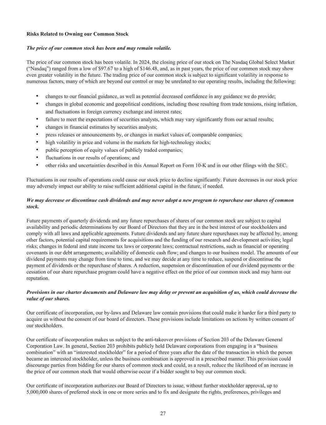 与拥有我们的普通股相关的风险我们普通股的价格一直并可能保持波动。我们普通股的价格一直在波动。2024年,我们股票在纳斯达克全球精选市场(“纳斯达克”)的收盘价从97.67美元的低点到146.48美元的高点不等,与往年一样,未来我们普通股的价格可能会出现更大的波动。我们普通股的交易价格会因应众多因素而大幅波动,其中许多因素超出我们的控制范围,或可能与我们的经营业绩无关,包括:•我们的财务指引发生变化,以及对我们提供的任何指引的信心可能下降;•全球经济和地缘政治状况发生变化,包括贸易紧张局势、通胀上升以及外汇汇率和利率波动导致的变化;•未能达到证券分析师的预期,这可能与我们的实际结果有很大差异;•证券分析师的财务估计变化;•可比公司的新闻稿或公告,或市值变化;•高科技股票市场的价格和数量高度波动;•公众对上市公司股权价值的看法;•我们的经营业绩波动;以及•本年度报告的10-K表格和我们向SEC提交的其他文件中描述的其他风险和不确定性。我们经营业绩的波动可能导致我们的股价大幅下跌。如果需要,我们股价未来的下跌可能会对我们未来筹集足够额外资本的能力产生不利影响。我们可能会减少或停止现金股息,并且可能永远不会采用新的计划来回购我们的普通股股份。未来支付季度股息和任何未来回购我们普通股的股票取决于资本可用性和董事会定期确定它们符合我们股东的最佳利益并遵守所有法律和适用协议。未来的股息和任何未来的股票回购可能会受到(其中包括)收购的潜在资本要求和我们研发活动的资金;法律风险;联邦和州所得税法或公司法的变化;合同限制,例如我们的债务安排中的财务或经营契约;国内现金流的可用性;以及我们的业务模式的变化等因素的影响。我们的股息支付金额可能会不时发生变化,我们可能会随时决定减少、暂停或停止支付股息或回购股份。减少、暂停或停止我们的股息支付或停止我们的股票回购计划可能会对我们普通股的价格产生负面影响,并可能损害我们的声誉。我们的章程文件和特拉华州法律中的规定可能会延迟或阻止对我们的收购,这可能会降低我们股票的价值。我们的公司注册证书、我们的章程和特拉华州法律包含的条款可能会使第三方更难在未经我们董事会同意的情况下收购我们。这些规定包括对经我们股东书面同意的行动的限制。我们的公司注册证书使我们受《特拉华州一般公司法》第203条反收购条款的约束。一般来说,第203条禁止公开持有的特拉华州公司在该人成为相关股东的交易之日起三年内与“相关股东”进行“业务合并”,除非该业务合并以规定的方式获得批准。这一规定可能会阻止各方竞标我们的普通股股份,因此可能会降低如果投标人试图购买我们的普通股,我们的普通股价格上涨的可能性。我们的公司注册证书授权我们的董事会在无需股东进一步批准的情况下,在一个或多个系列中发行最多5,000,000股优先股,并确定和指定权利、优先权、特权和27